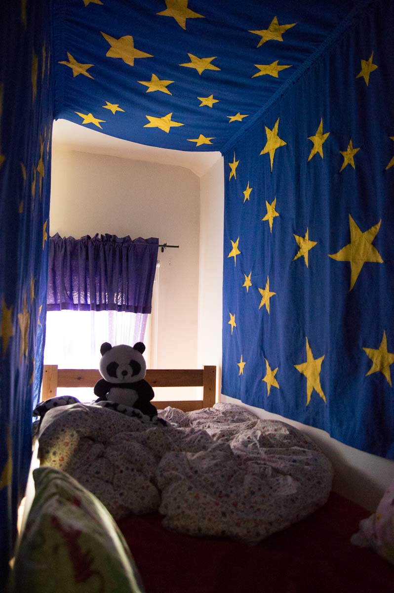 Ingrid’s bed curtains, messy bed, and favourite cuddly panda.
