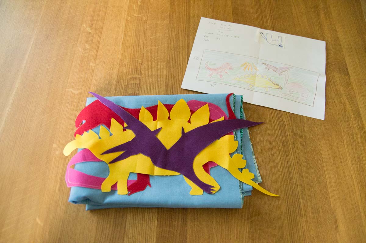 Ingrid’s has stars and a full moon. Adrian wants dinosaurs on his. This morning we prepared a first draft of the design together: he told me what he wanted and I drew it. The curtain will have a red Tyrannosaurus, a yellow Stegosaurus, a purple Pterosaurus and a pink Diplodocus. Oh, and a volcano. With lava.