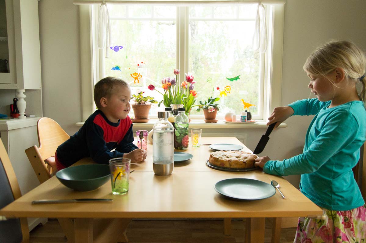 Ingrid was bored and wanted to bake a cake. She got to bake; I got a lovely rhubarb cake.