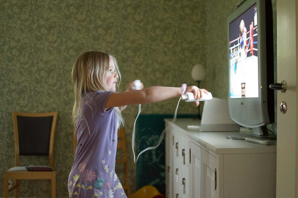 I bought some more Wii games for Ingrid – active games just like Just Dance. This is her doing boxing in Wii Sports. She goes all in.