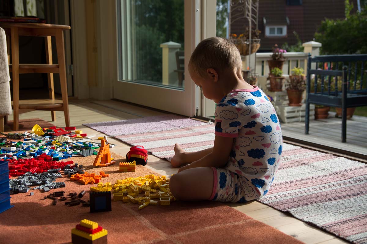 I went to Skansen today with the kids, while Eric was away in Prague with work. You’d think that a place like that would offer a multitude of photo opportunities – all these activities, ice creams, pancake lunch, fairground rides etc. But it really isn’t. It’s all so crowded, I’m busy and distracted, Adrian mostly won’t step more than a meter away from me, Ingrid mostly wants to go off on her own and look at stuff in the shops… So even after a full day at Skansen, the day’s photo is of Adrian and Legos.