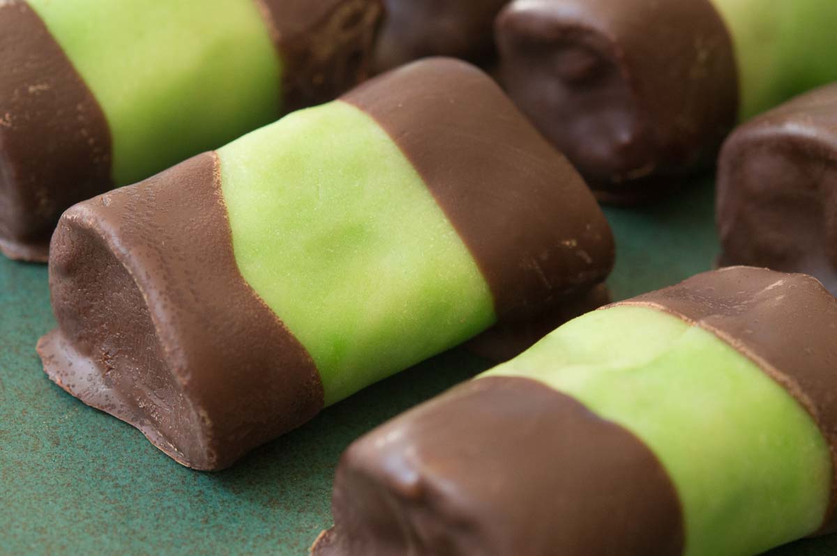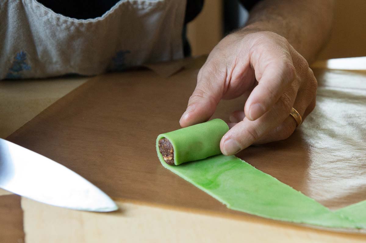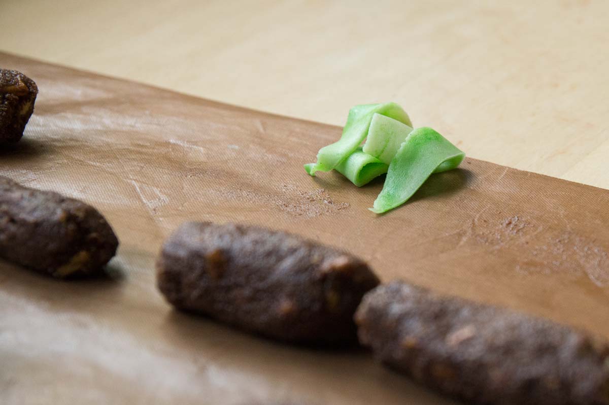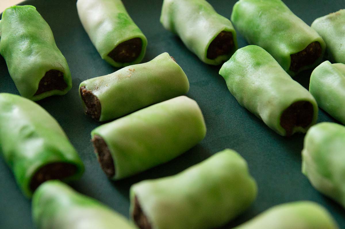 That core is wrapped in a skin of marzipan. Traditionally, dammsugare just have to be green. Occasionally someone makes pink or white ones but they just look wrong to me! You can actually buy green marzipan in Swedish supermarkets, in convenient rolled-out sheets, because green marzipan is also essential for Sweden’s most popular cake, the princess cake. But we made our own from plain marzipan and green food colouring. Kneading the colouring into the marzipan was hard and boring work for Ingrid so she left it marbled, which looked quite decorative. The colour evened out with time so they became plainer overnight.