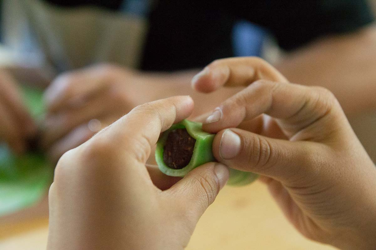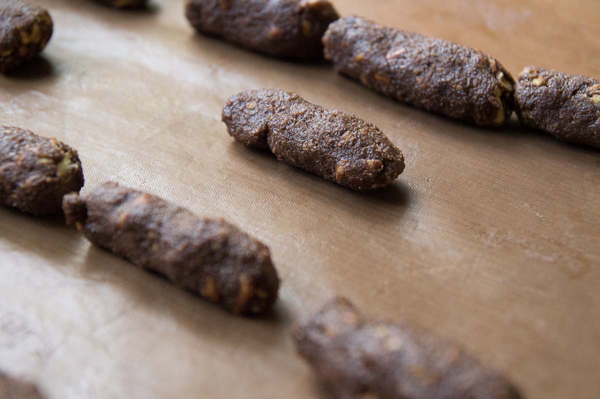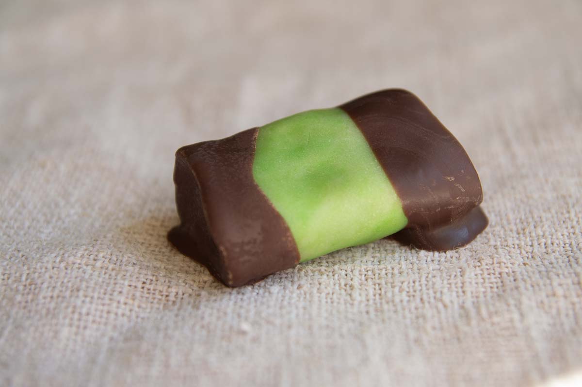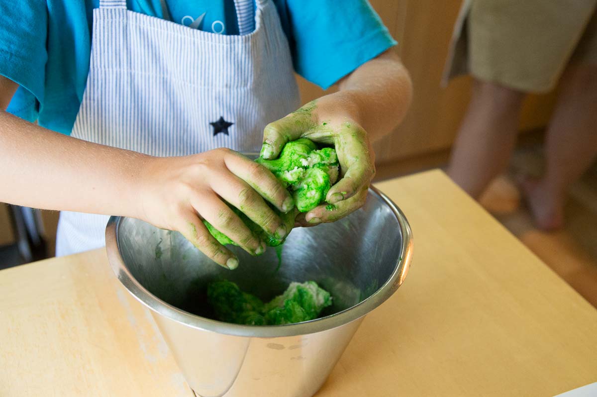 That core is wrapped in a skin of marzipan. Traditionally, dammsugare just have to be green. Occasionally someone makes pink or white ones but they just look wrong to me! You can actually buy green marzipan in Swedish supermarkets, in convenient rolled-out sheets, because green marzipan is also essential for Sweden’s most popular cake, the princess cake. But we made our own from plain marzipan and green food colouring. Kneading the colouring into the marzipan was hard and boring work for Ingrid so she left it marbled, which looked quite decorative. The colour evened out with time so they became plainer overnight.