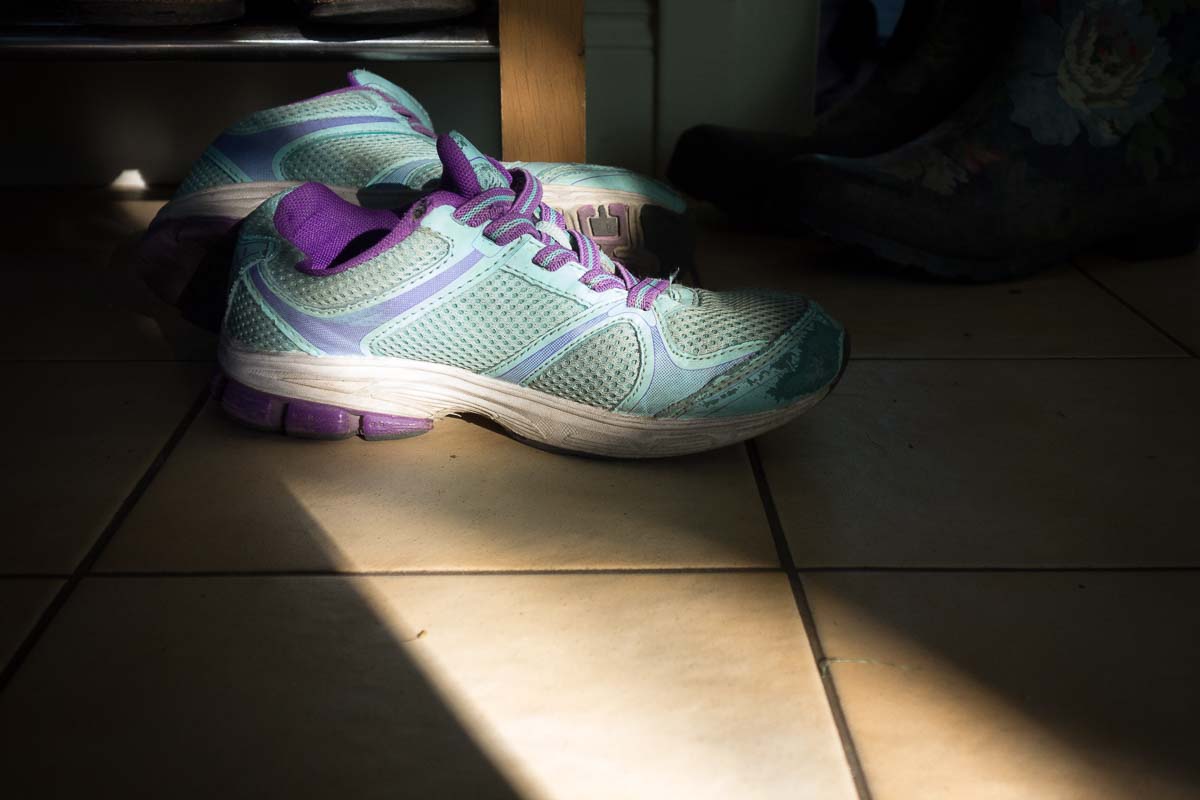 Shoes used to live long enough to be inherited by the next kid. These shoes won’t – and they are only a few months old. I guess they have lived a hard life. Toes scuffed, holes in the fabric at the top corners, outer layer of sole lost on one, the backs squashed…