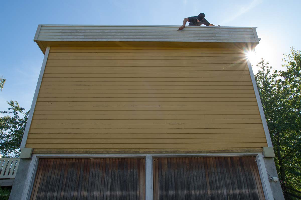 The builders did their part renovating the roof. Now Eric’s painting the new siding boards they put up around the roof.