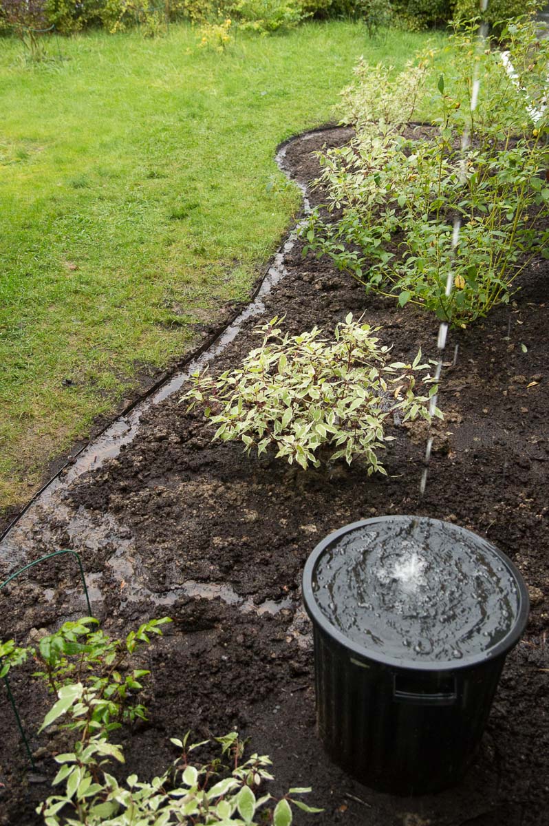 We’ve had a lot of rain today and it’s washing away the soil I just spread here! Well, I guess it’s good to discover this kind of bug early in the project’s life – before this area is full of newly planted plants. The rain barrel definitely needs upgrading to something bigger (and less ugly) and we need a drip irrigation hose to lead the water to the plants rather than to the street. And the soil needs to be covered with mulch of some sort to help keep it in place.