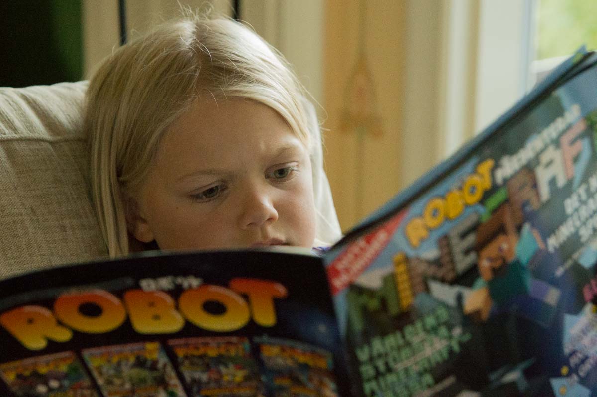 Meanwhile she has her usual interests: watches Minecraft videos, plays Minecraft, reads Kalle Anka, occasionally practices magic tricks.