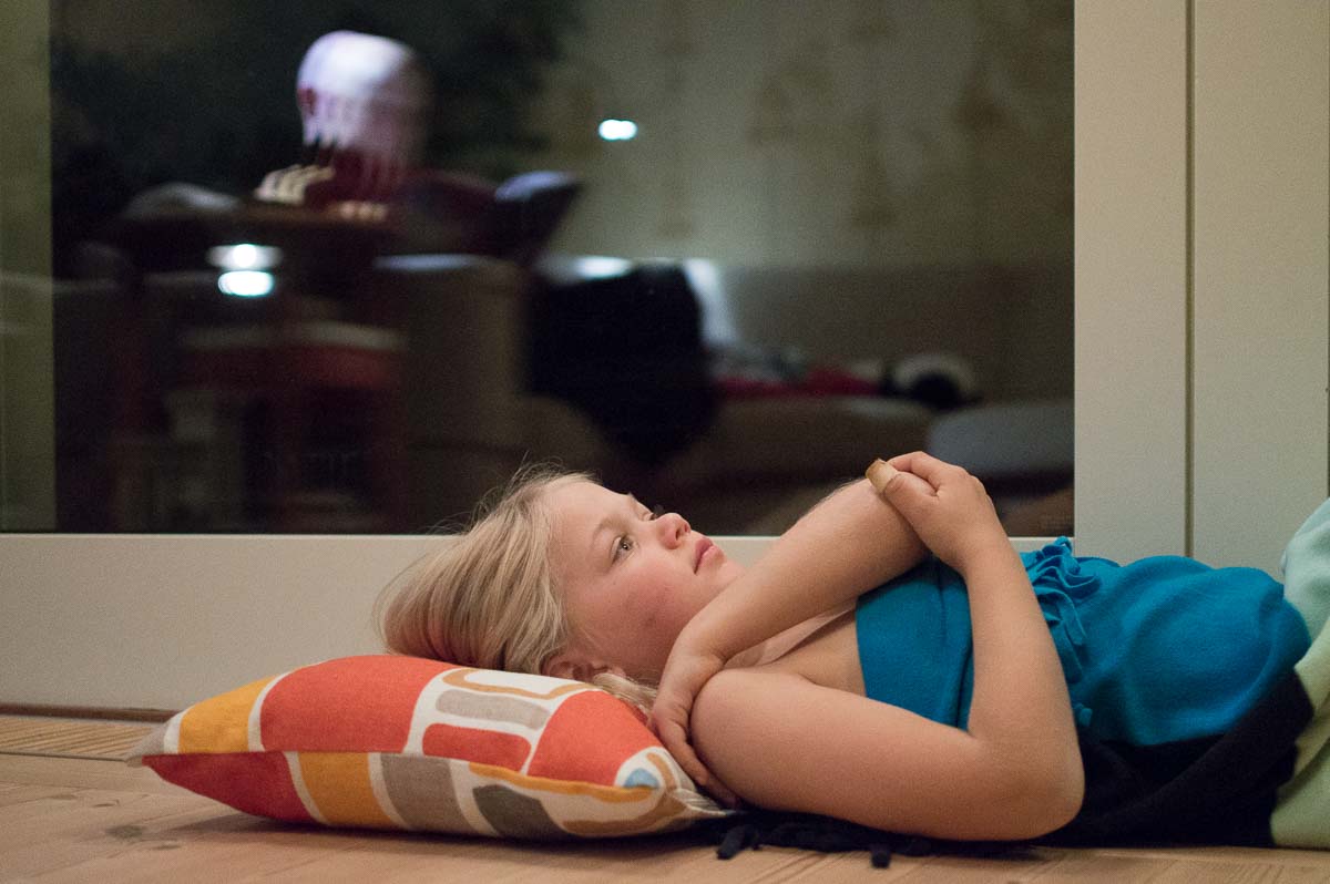 Ingrid at her favourite spot during the cold season: the long heating strip along the side of the living room floor. You can see Eric’s reflection in the background, reading a bedtime story for her. The current story is Schlagersabotören, a LasseMaja adventure.