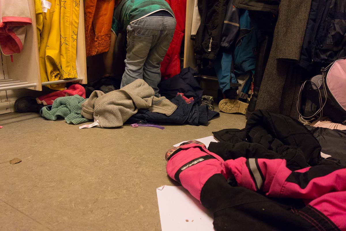 This is the mess that met us in their cloakroom. I don’t normally see it in this state because when we leave, maybe half the kids have left already and taken their clothes with them. And often they are playing out in the yard when I arrive, so the clothes are on the kids instead of on their hooks. But now: all their clothes, plus bags, dropped toys, super important drawings mixed up with random pieces of paper… It struck me that this is probably not an unusual sight during daytime, when the clothes of two groups of kids (30+ in total) are crammed into this small room. And I tried to imagine what this room looks and feels like when those kids try to put their clothes on to go outside…