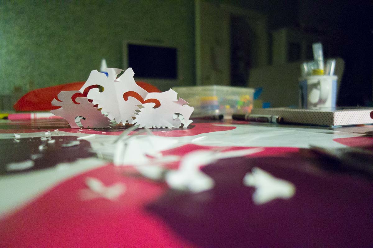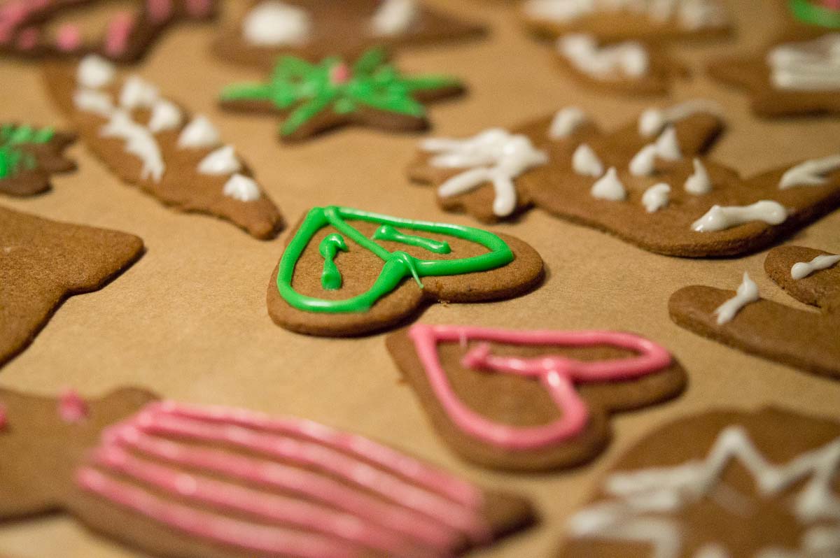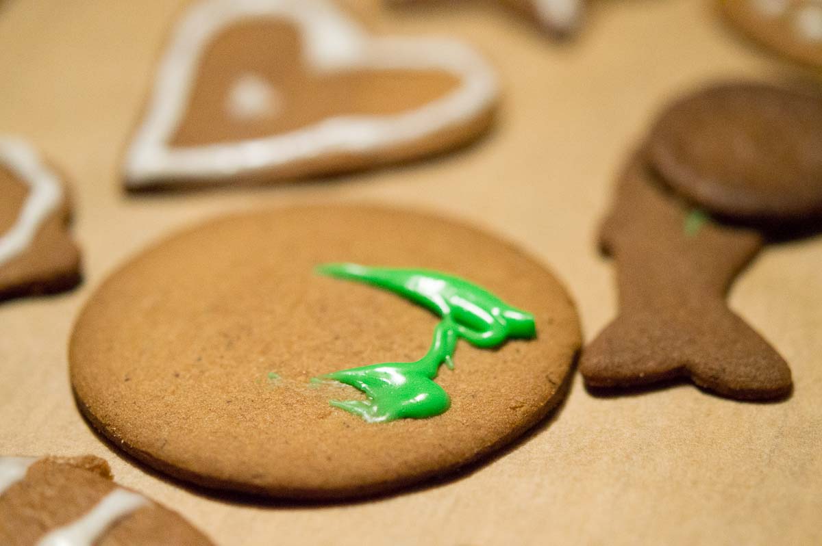 I was so annoyed by the icing that I threw it all out, so we went back to store-bought icing for decorations. It doesn’t flow very well so it’s hard to get the lines nice and even. Next year I think it’ll be sugar for glueing but homemade icing for decoration.