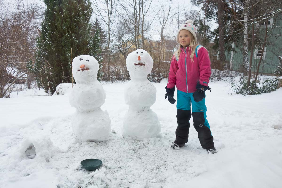 After a long time of proper winter cold, the weather has turned warm, almost overnight, and the snow sticks together. Ingrid rushed out as soon as she heard this and made two snowmen before she tired.