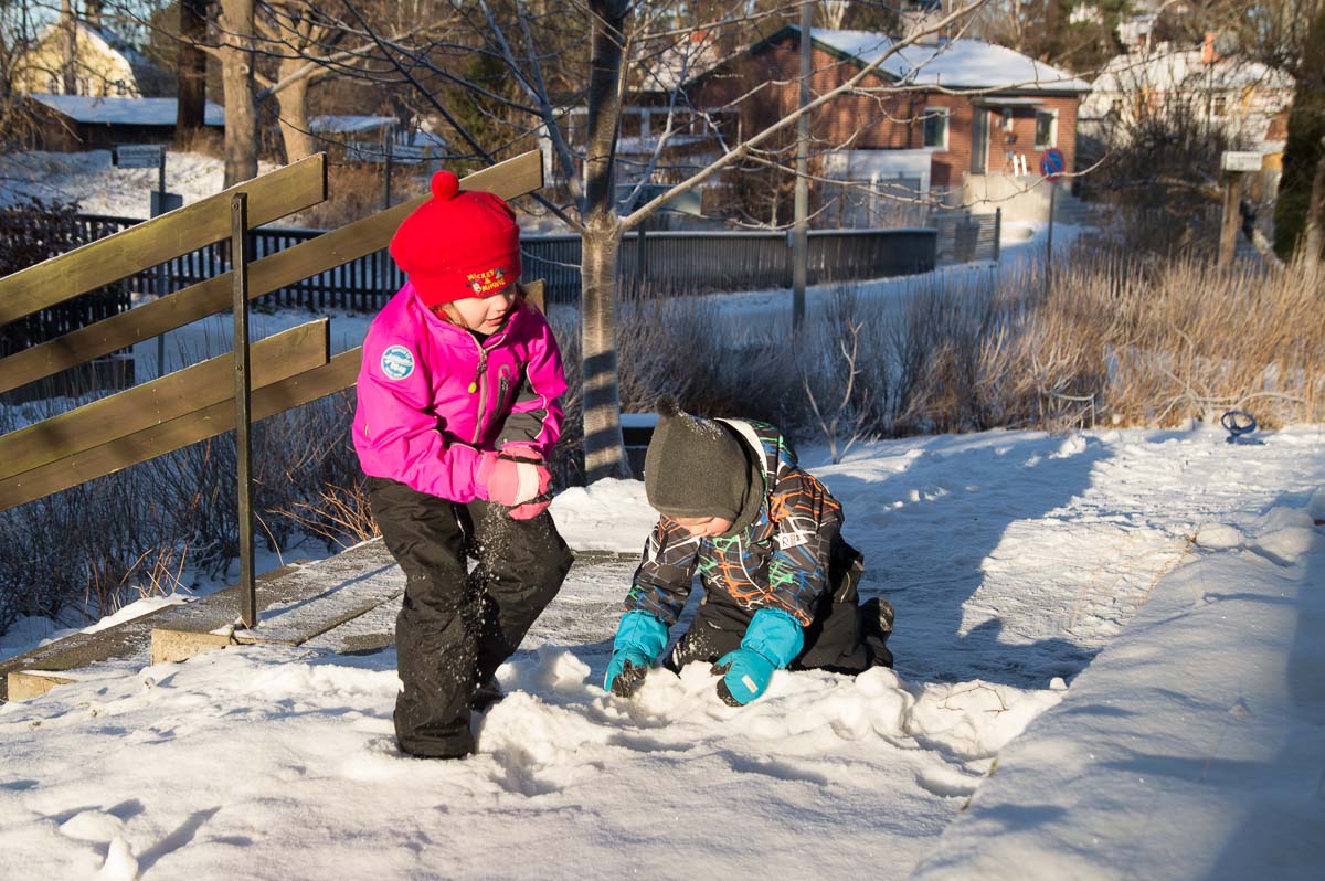 The fresh snow makes the kids want to do all kinds of things with it but the snow is too cold and does not stick together at all. Ingrid’s attempts at snowballs disintegrated before they left her hand.