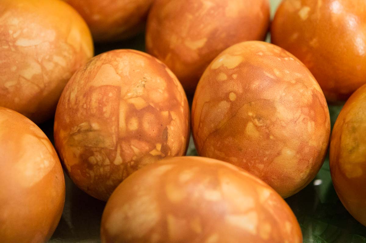 This year we learned two new tricks. One: wetting the onion skins before putting them around the eggs makes them a lot easier to handle. Two: aluminium foil can be used for wrapping the onion-skin-wrapped eggs even though it is not permeable, and is a lot more flexible than paper.