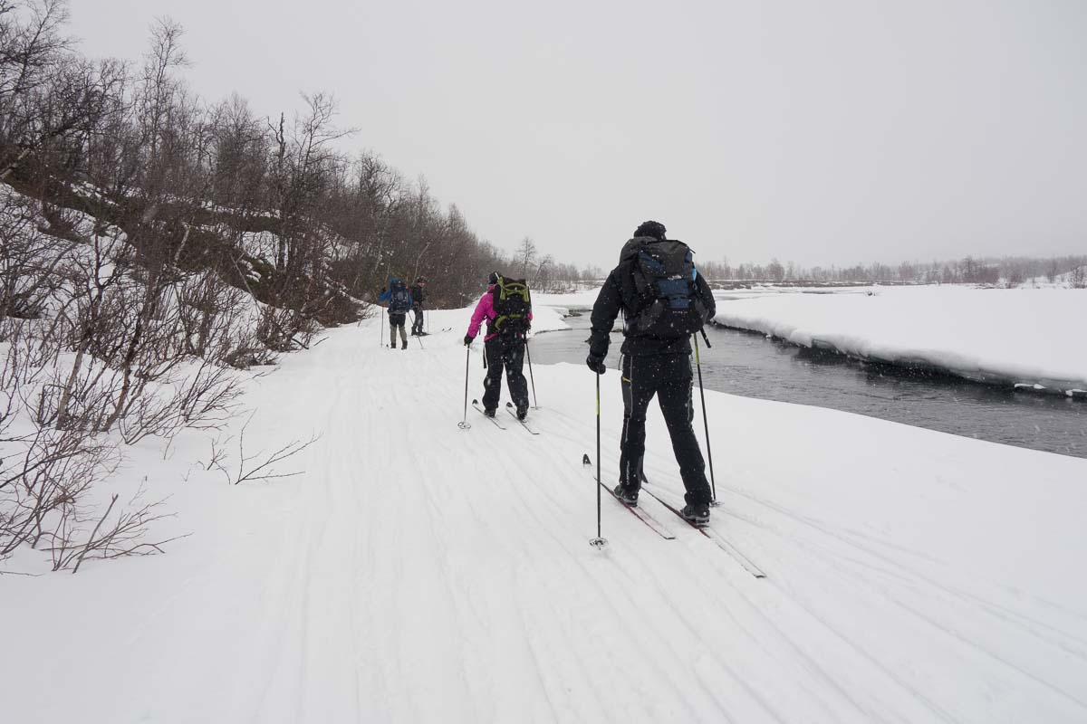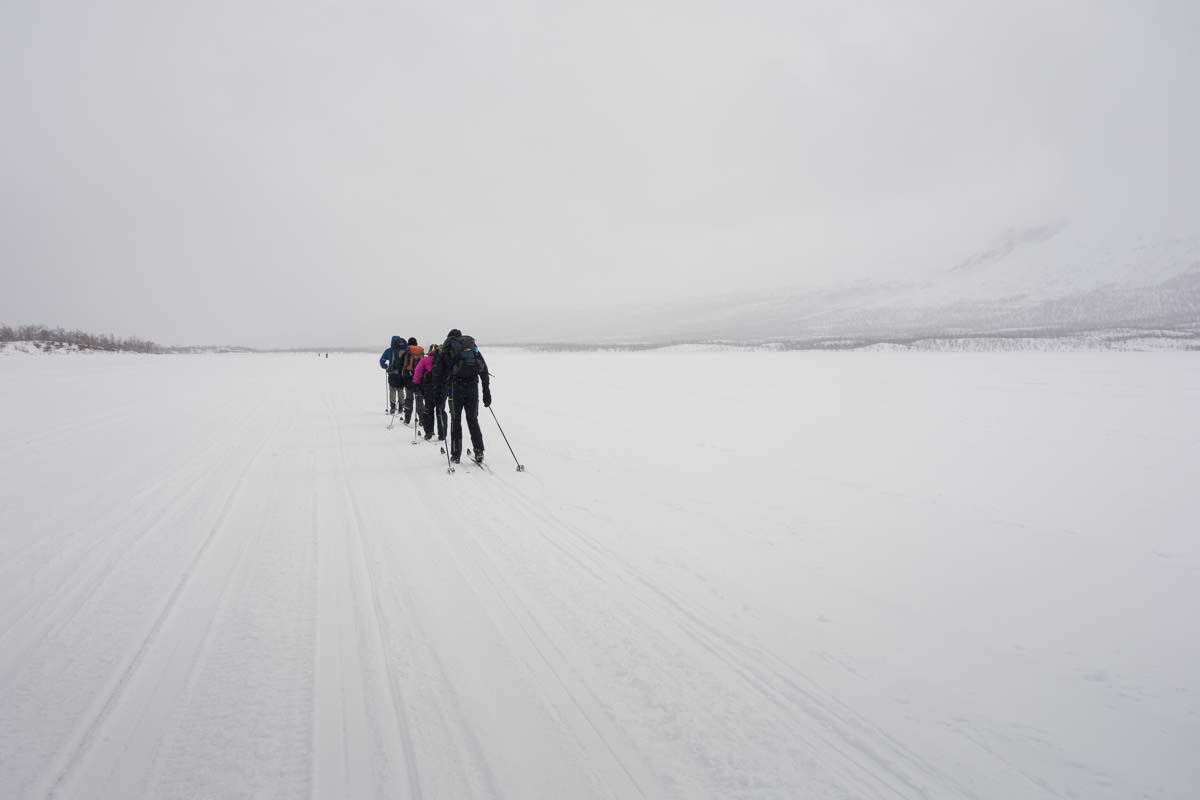 This was an optional day of skiing; we had the option to be transported to Nikkaluokta by snowmobile. About half the group chose the option to ski, while the other half lounged around the mountain station for half the day and the motored down to Nikkaluokta in (probably) about half an hour.