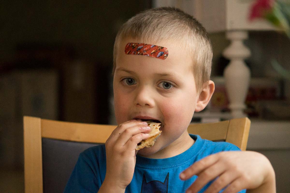 He comes in and puts on his pyjamas. Now that it’s spring and warm outside, he likes to wear pyjama shorts only. Until recently I then applied a fat salve on the dry scaly skin on the backs of his hands, and a slightly lighter salve on slightly less dry parts, but I think we can cut down on this now.