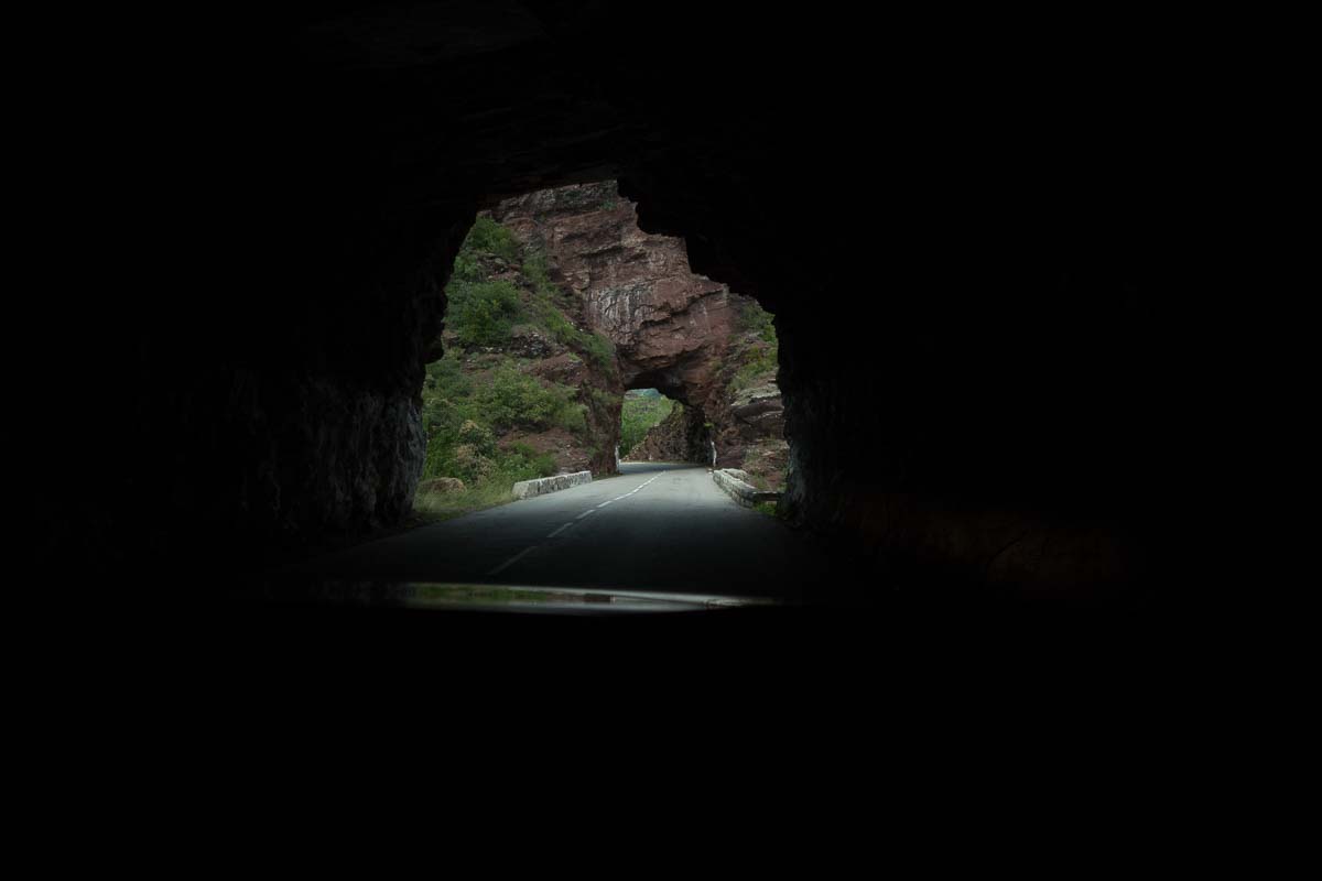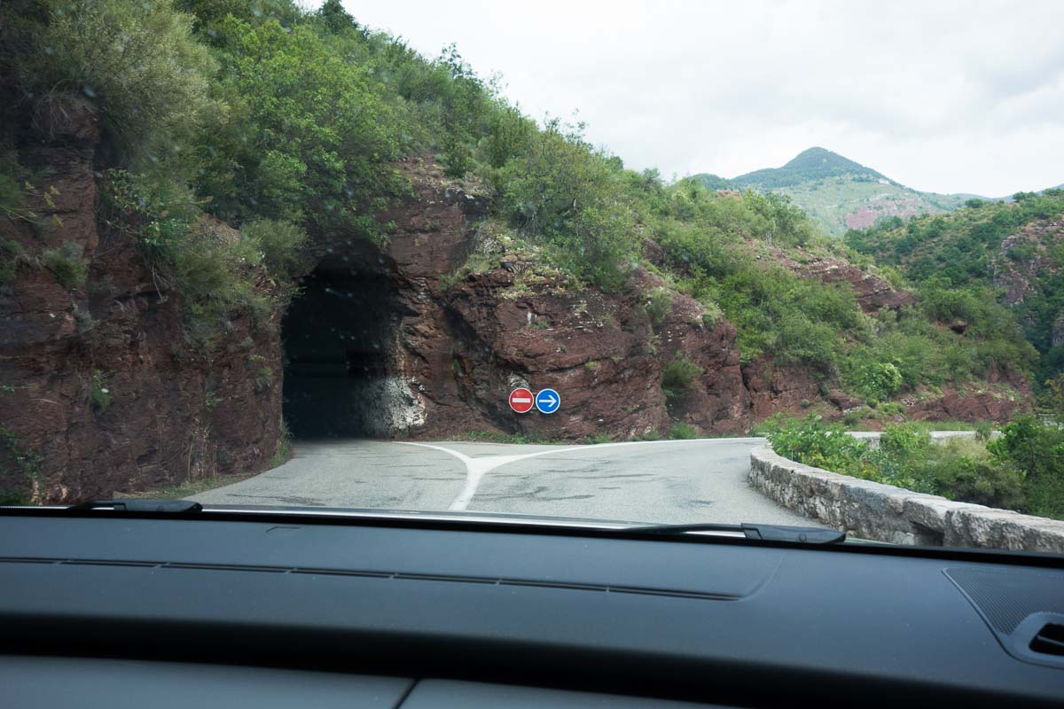Nice was all hot and steamy and palm trees, but the mountains were right there around the corner, and the further we drove, the more mountainous our surroundings got. The final 20 km of the road, after leaving the main highway, were narrow and twisty and with interesting tunnels. Often the tunnels were so narrow that they only fit one lane, so the other lane passed on the outside of the mountain. And the final 7 km were on an even smaller road, all uphill, with one hairpin turn after the other and a worn and bumpy road surface as well. When we got to the top Adrian was quite badly carsick and said he didn’t ever want us to drive down that road again.