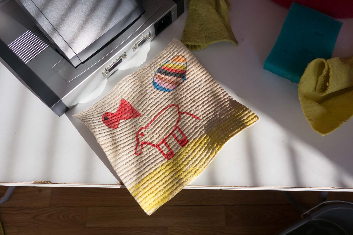 I ran across this old dishcloth that Ingrid decorated for my mum many years ago. It’s old and worn enough to only be used for really dirty jobs nowadays. But it made me feel better about the whole thing.