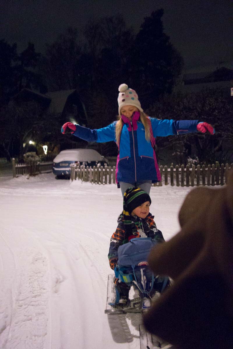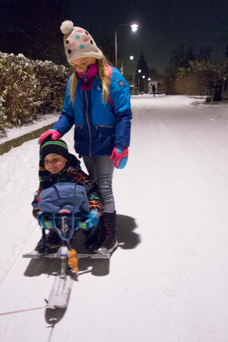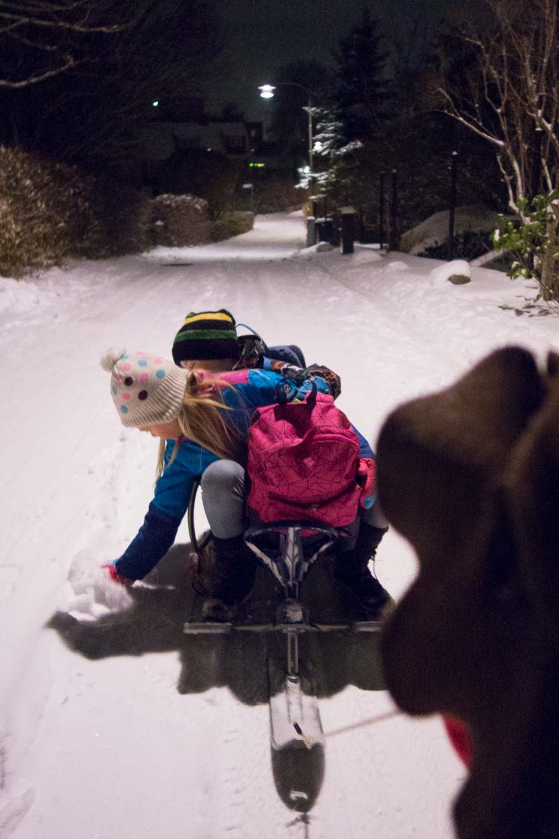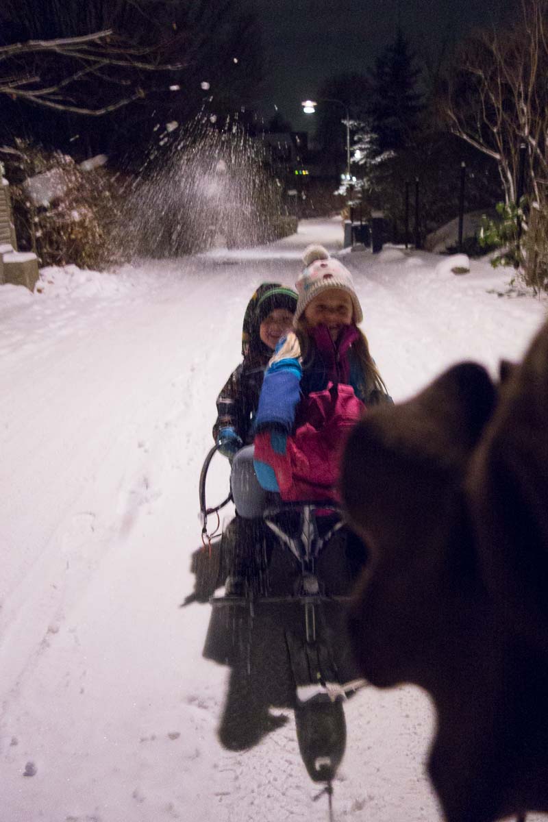 We had some snow overnight, and then some more during the day, so the kids got a sled ride home. An exceptionally good ride, even, because the snow ploughs had not had time to clean our streets. A thick layer of snow, packed hard by cars, untouched by plough or gravel.