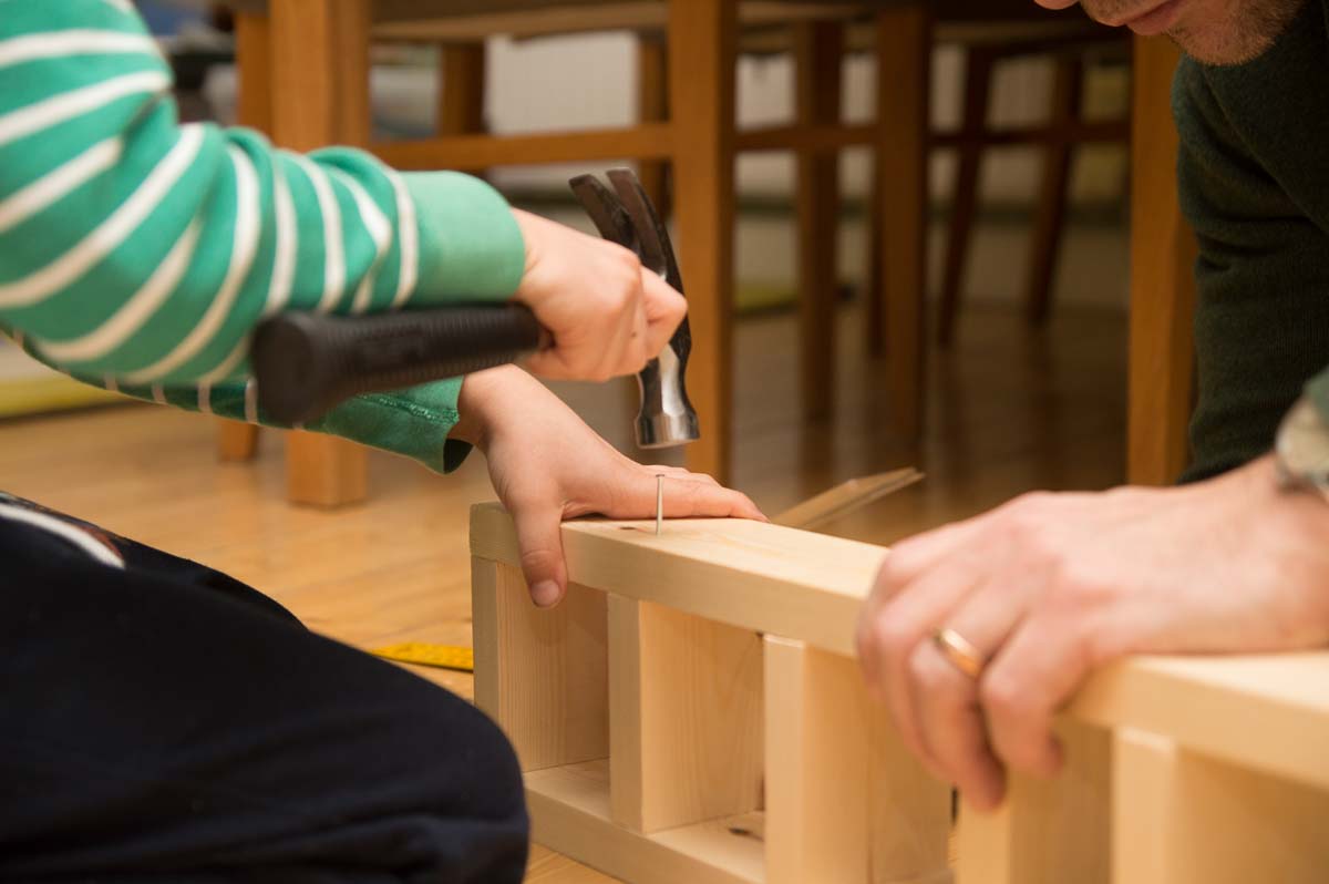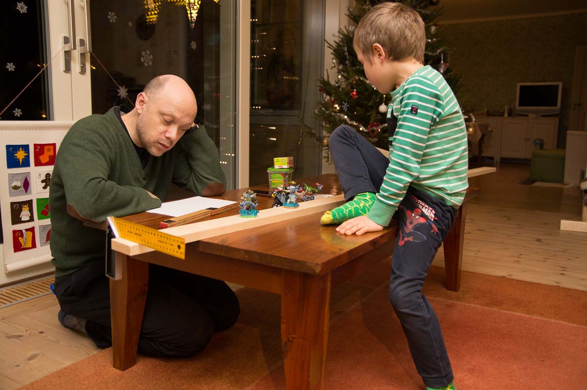 The Skylanders shelf has moved from design stage to building stage. Eric did the sawing; Adrian is doing the assembly.