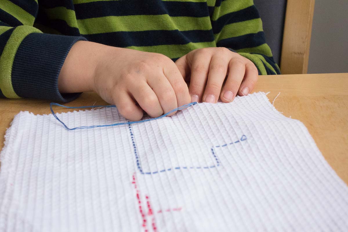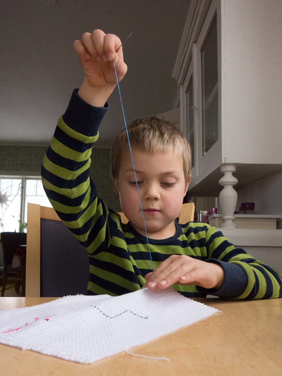 Adrian has (re-)discovered embroidery, and sewing. He embroiders squiggly things on waffle cloth, and sews little fluffy felt or fleece pillows.