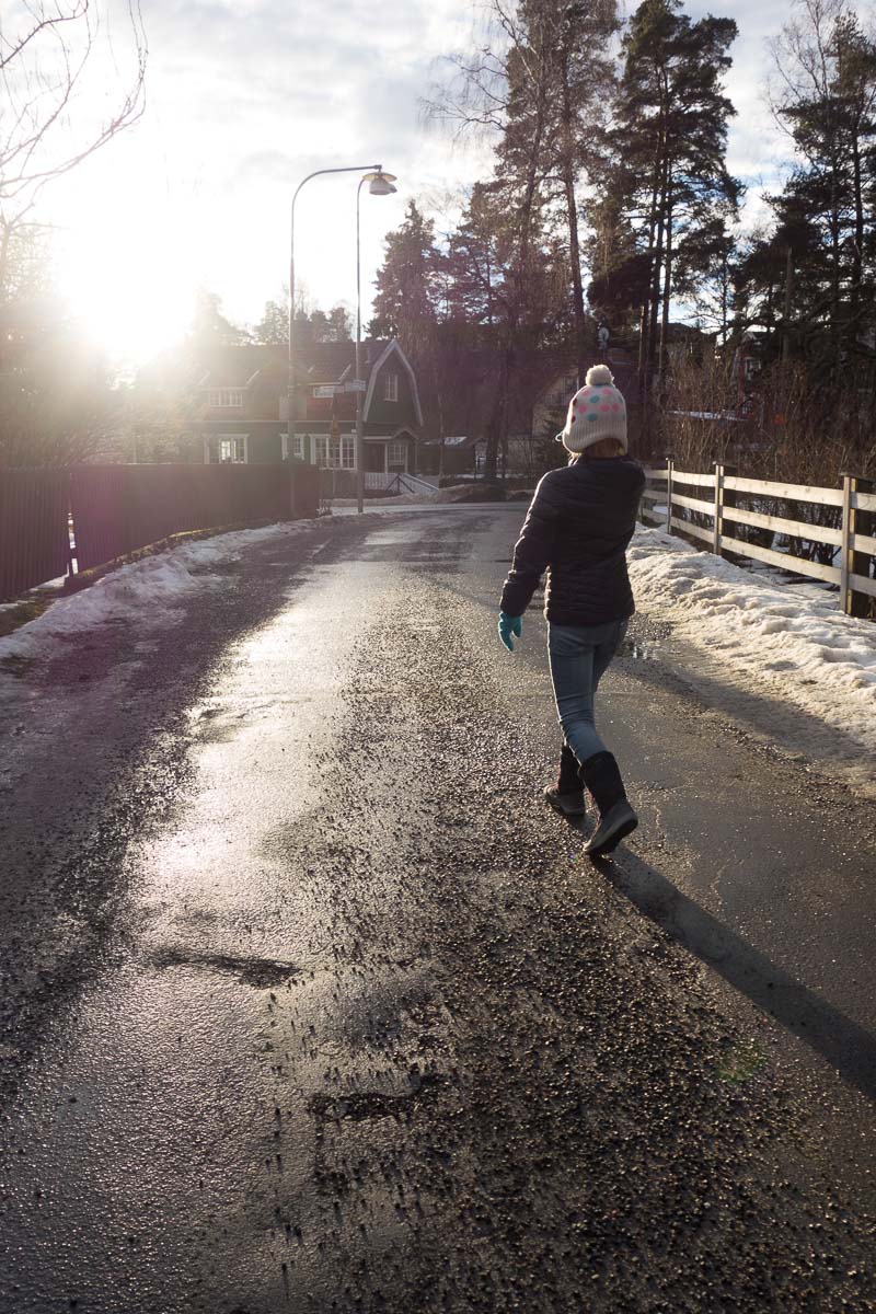 Ingrid, walking down our street. With wet asphalt and no snow, you might notice… Apart from the fact that the sun barely reaches above the houses, this doesn’t really feel like winter at all, even though we should be right in the middle of it.