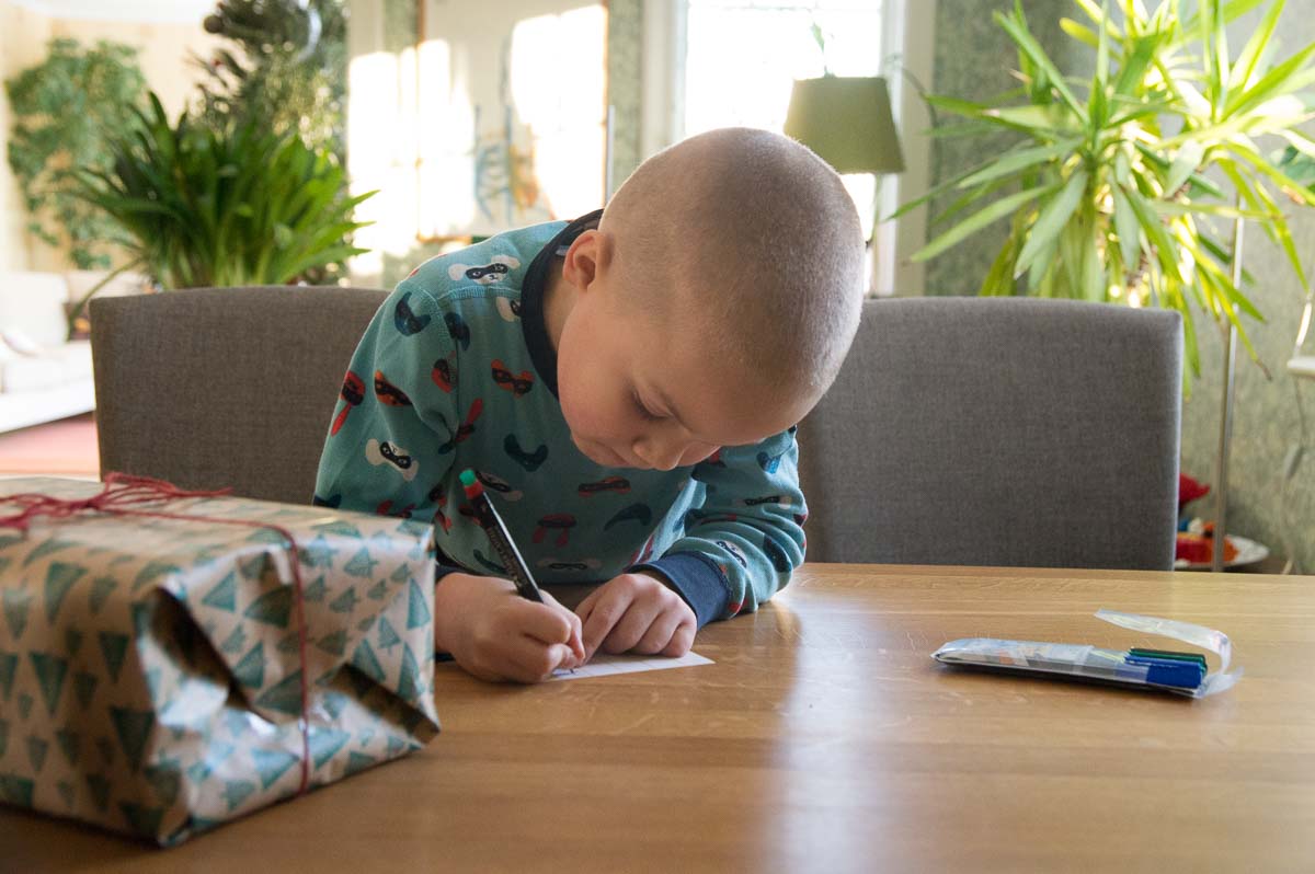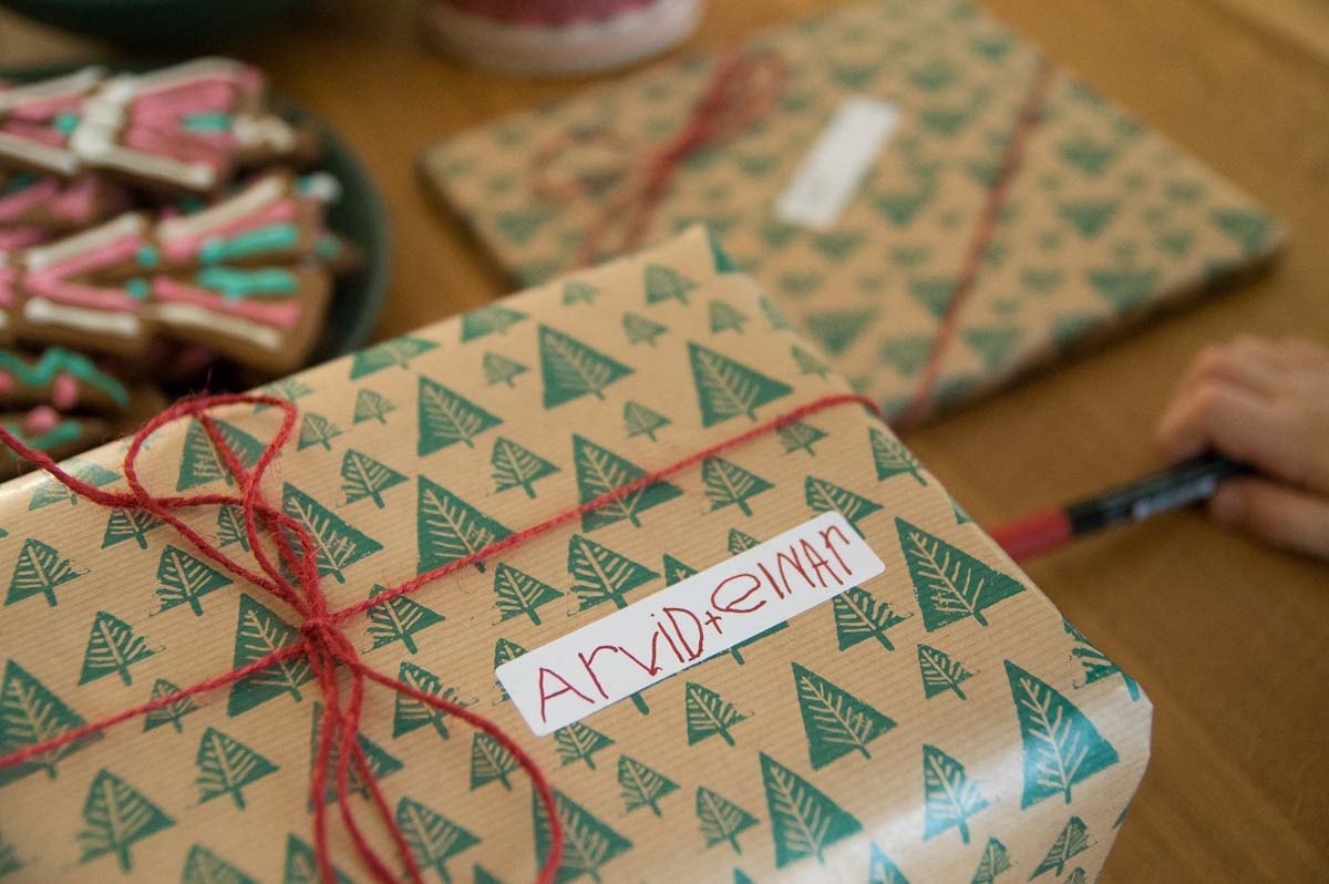 Adrian and I wrapped Christmas gifts for his cousins. Mostly I wrapped, while he taped and wrote labels. “Look, I made a lowercase R!”