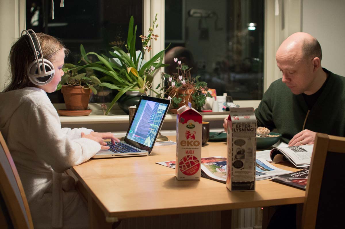 Just like during last year ski trip, and like the year before, the weather here in Stöten is cloudy and the air is full cloud and fog and snow, especially at the top. And it’s windy. When we get to the top of the hill, our thoughts focus on how to immediately start getting down the hill, in between the trees, away from the wind.