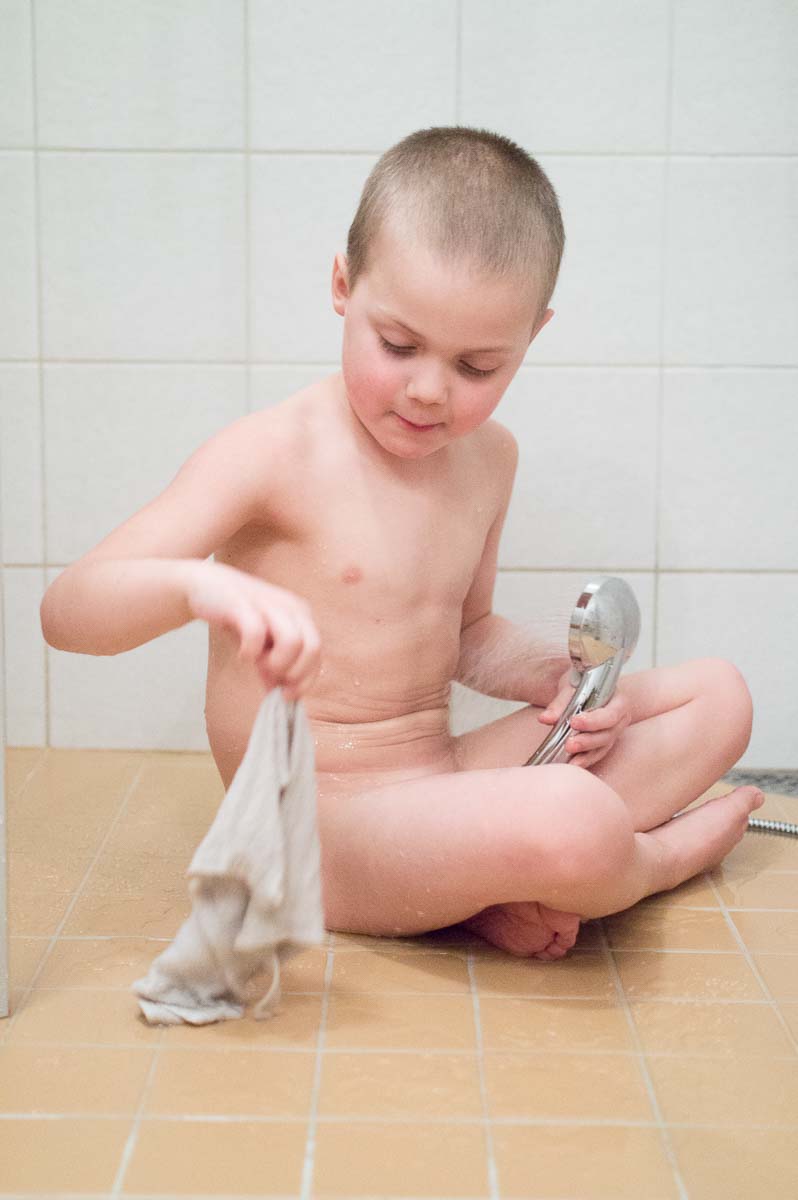 And as soon as he is in the shower, it’s like a switch is thrown. A trickle of warm water and a washcloth and his own company keep him entertained for a long time. He sits on the heated floor and plays and just sort of talks to himself. Not an awful lot of actual showering goes on in there, I suspect, but he does get some water on all body parts, and the bottom gets a nice long soaking.