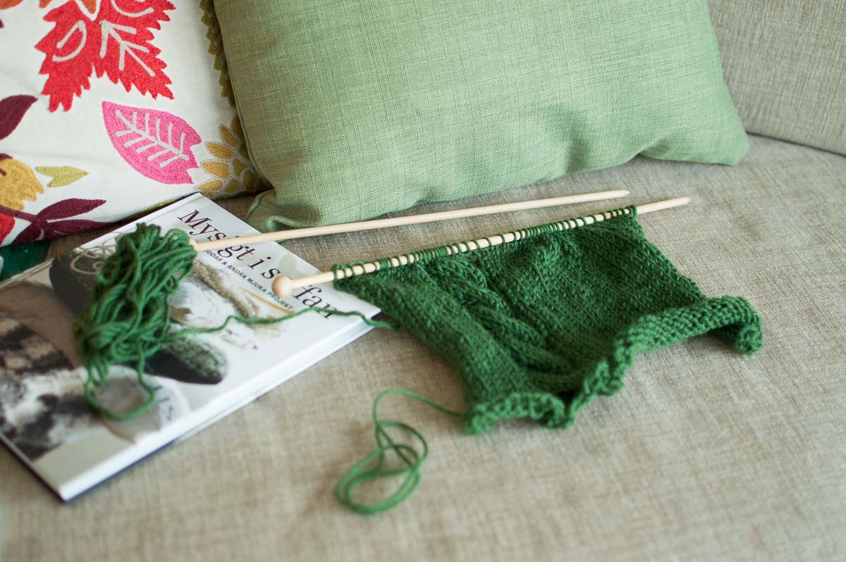 I was struck by a sudden urge to knit something. Preferably something quick and easy that can give rewarding results in not much time. Fraying embroidery on a sofa cushion gave me the answer: I’ll knit a new cushion cover.