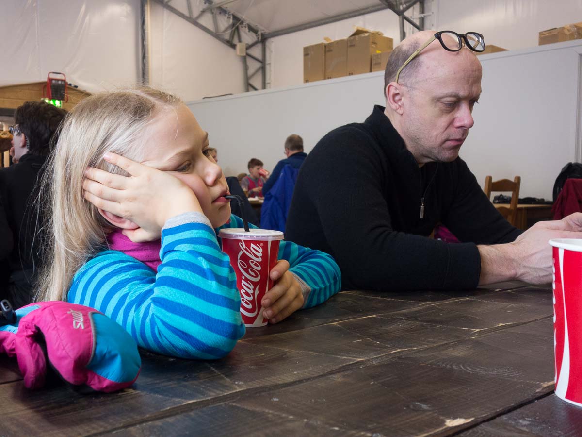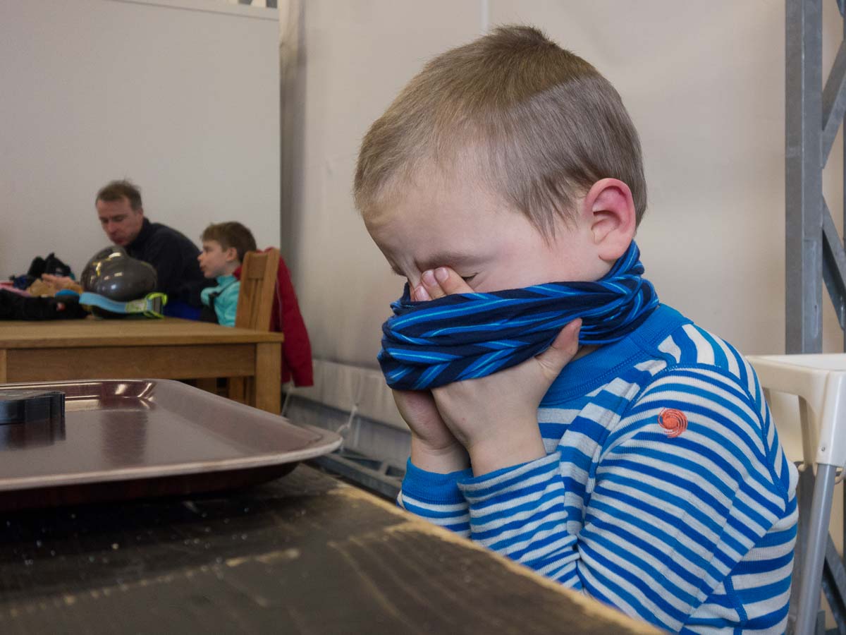 After the first half day, everybody is pretty tired. We don’t do this very often, so our bodies need some time to get used to this again. Eric had a ski trip with work recently, but it’s been a year since Ingrid and I last did any skiing, and it’s the very first time Adrian stands on a pair of skis.