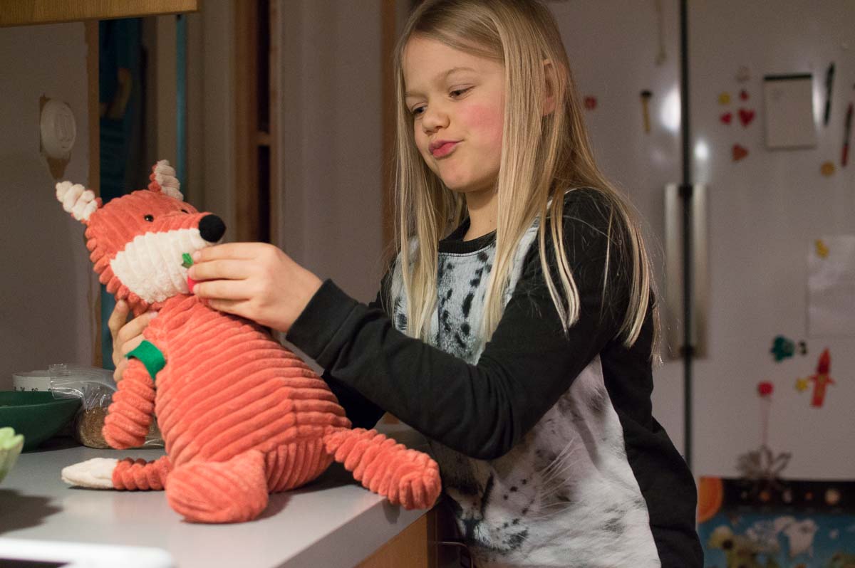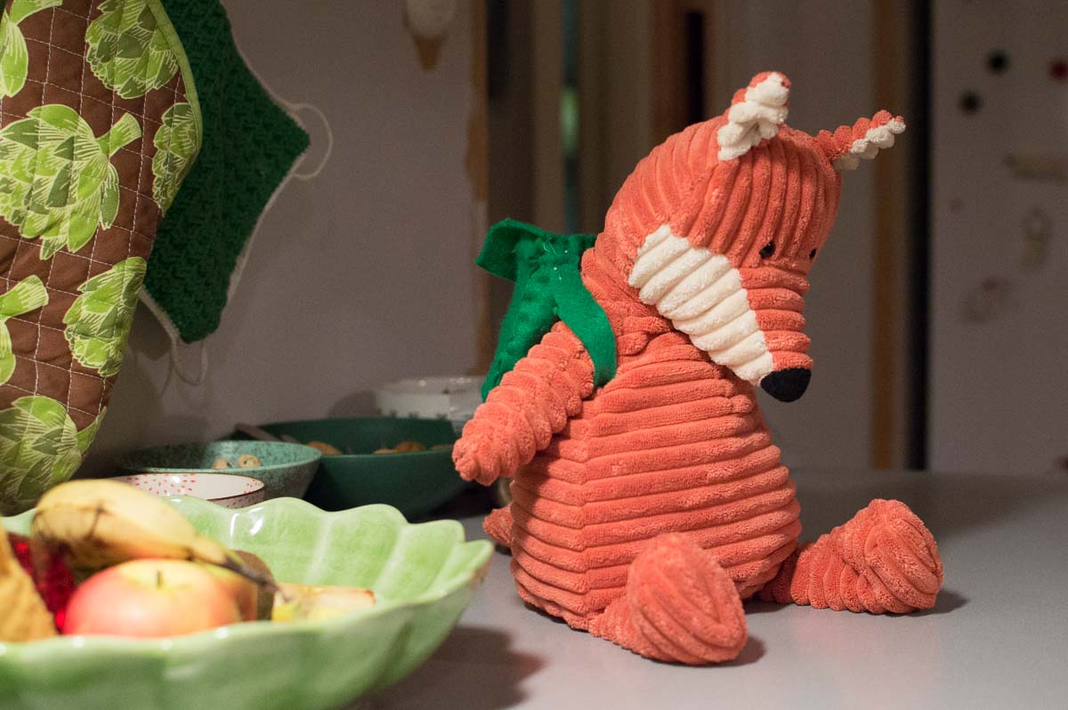 Ingrid doesn’t really play with any toys any more, but she has a few favourite cuddly animals: a large panda she likes to sleep with, a giant Donald Duck Tsum Tsum and a fox. The fox is super soft and cuddly, and a tad smaller than the panda, so it’s the one that Ingrid often takes with her when she travels. Like on scout hikes for example. Ingrid has made the fox its own little rucksack, with a cardboard toothbrush and toothpaste, a pillow and blanket, and an apple. And, since we’re planning and preparing for this year’s family ski vacation, the fox today also got skis, poles and goggles.