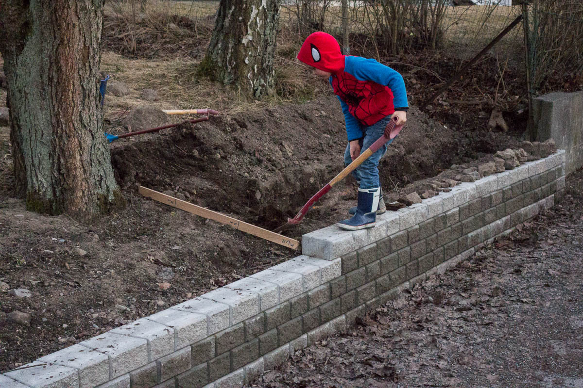 It’s spring – gardening season has started! I’ve taken the first steps in this season’s big project, which is to plant a hedge along the retaining wall that we had built last year, all the way along the two sides of the garden that face the street. Spiderman is helping me dig a ditch for the hedge.