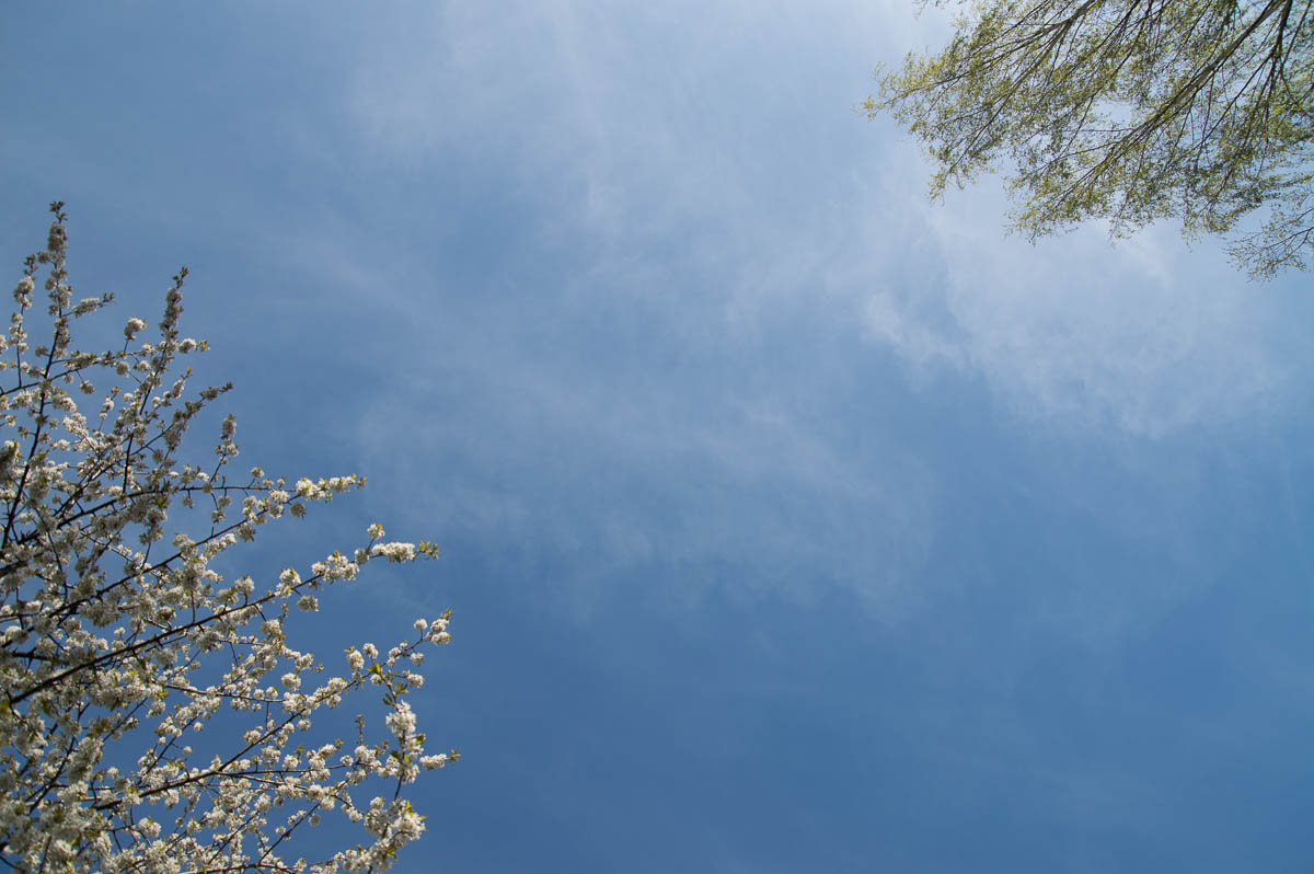 Blue sky, wispy clouds, flowering cherry tree, and the tender green of young birch leaves. Can life get any better than this?