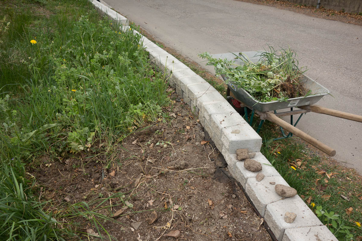What I hadn’t planned for were the weeds that came up in the meantime. It’s only half a year, I thought – how weedy can it get in that time? Plenty, it turns out. The earth along the wall that was bare last autumn is now covered in greater celandine, white nettle, couch grass and other unwelcome plants. They have… spread like weeds. Now I’ve spent a full day in total digging them up and carting away several barrowloads of biomass. Never again will I underestimate their growing power.