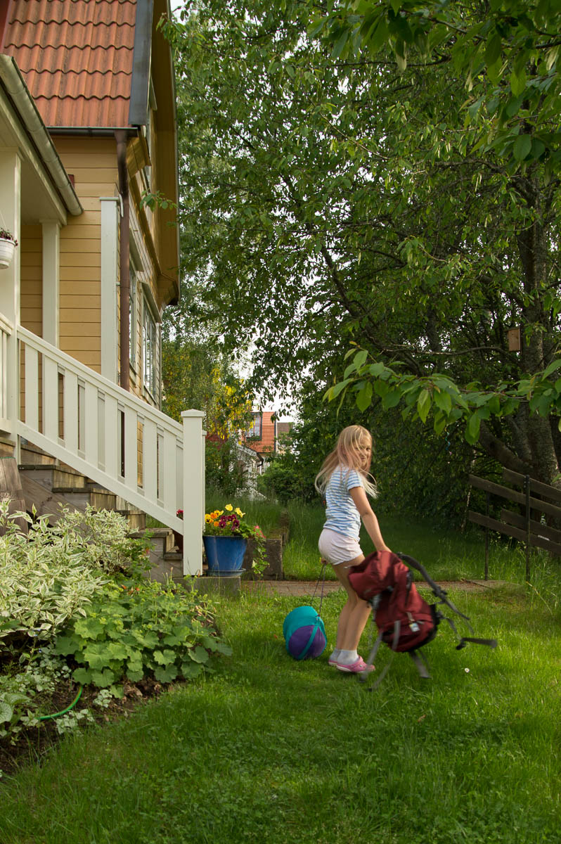 She has a 30-litre junior-sized backpack. That’s the largest model I could find that fits her not-so-tall body. It doesn’t really fit all her stuff for a week. We usually end up strapping the sleeping bag to the bag on the outside, which makes it a bit clumsy.