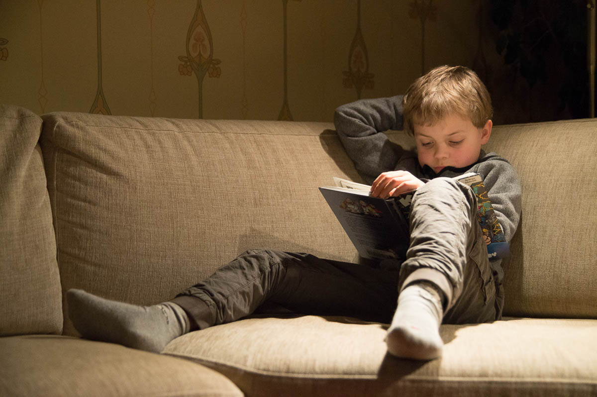 Adrian reading “Captain Underpants”. The book has butt jokes, people running around in their underpants, and a time machine made out of a portaloo. Absolutely perfect for a seven-year-old.