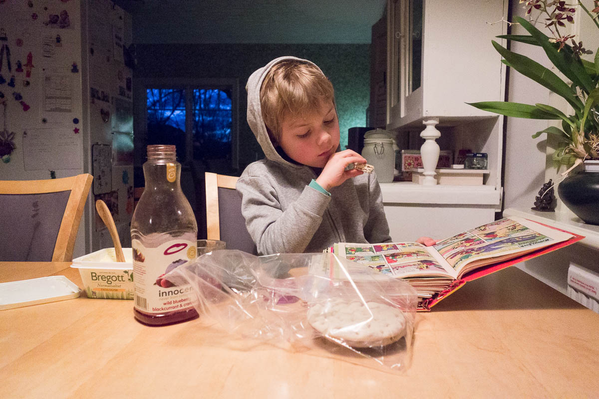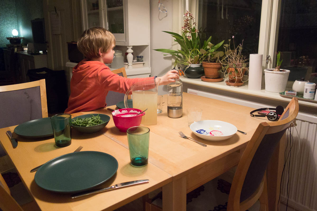 Adrian is often a bit sceptical about “Lina food” in advance. (Maybe Ingrid is as well, but at least she doesn’t keep saying so every time.) Afterwards he gives his verdict: thumbs up, thumbs down, thumbs sideways or something in between. Sometimes he is pleasantly surprised. One Lina recipe is now among his absolute favourite dishes. (Pasta with green peas and goat’s cheese.)