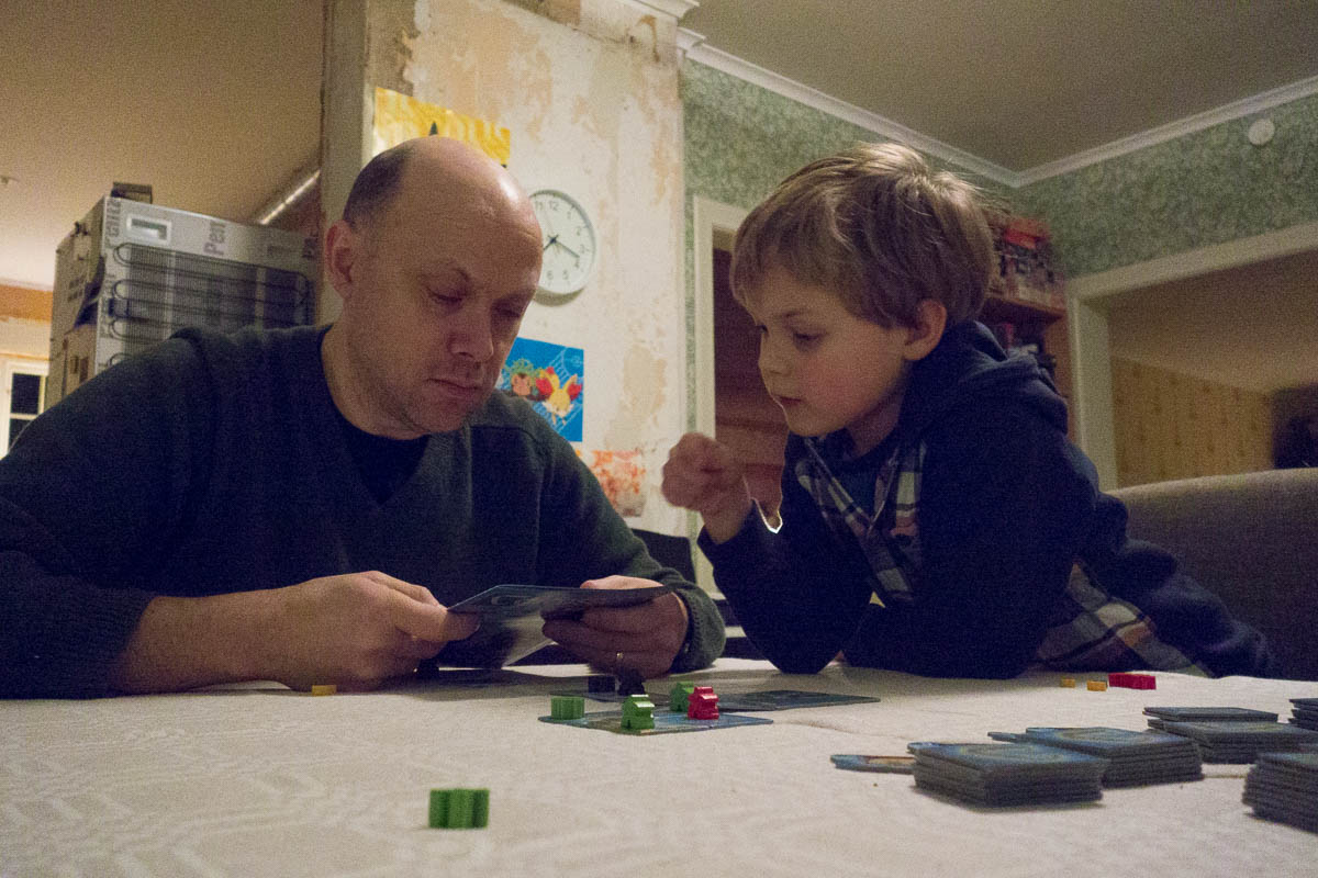 Playing a new board game. A new variety of Carcassonne, with lots of new rules to learn.