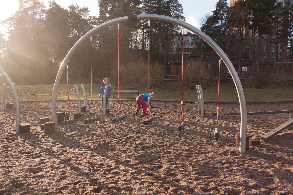 Right next to the parking lot where we started, we ran into a playground. That was a good start: it’s been a while since we’ve been to a new playground, and this one had a bit of a climbing / adventure trail and the kids always enjoy that kind of stuff.