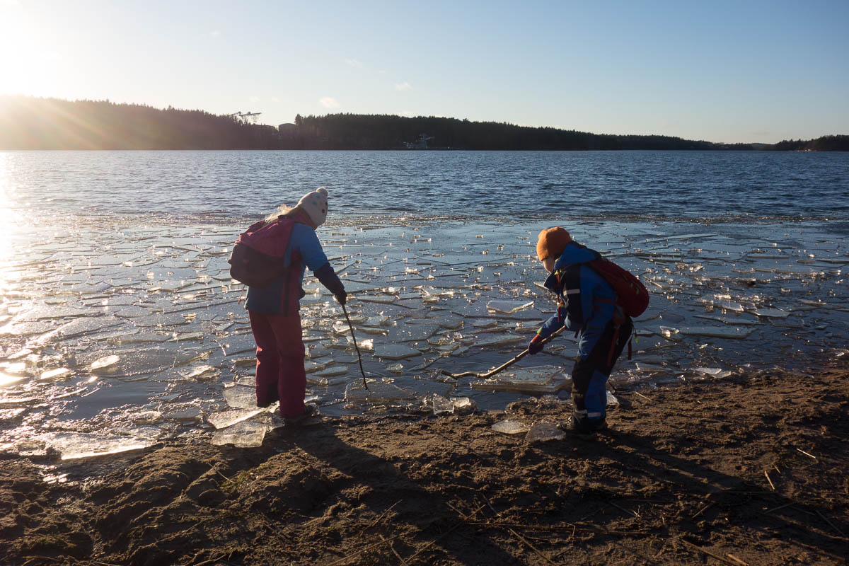 What little ice there had been on the lake had all broken up and lots of large pieces were floating near the shore. The kids tried to fish them out and push them to the beach, but they were slippery and heavy and fragile, so it didn’t go very well.