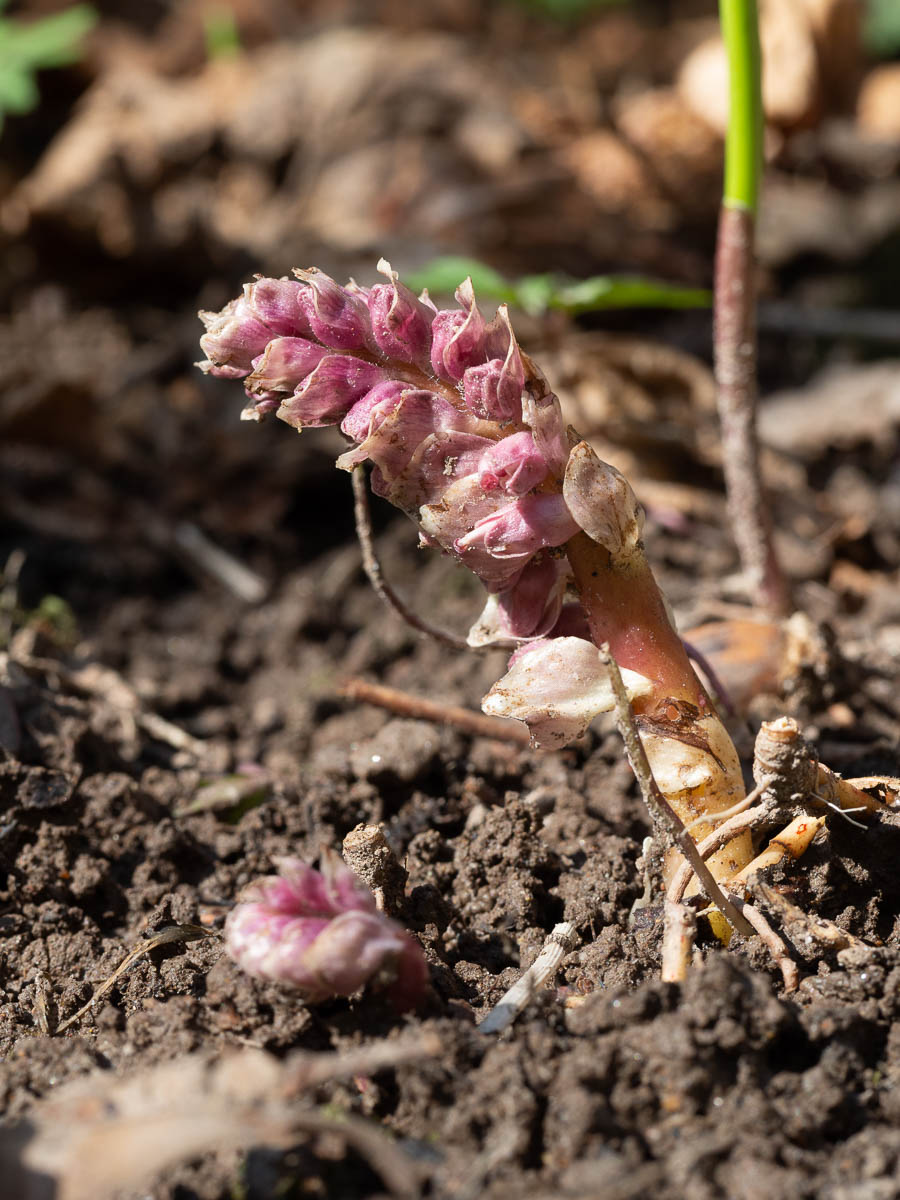 The coolest flowers I saw was the common toothwort (Lathraea squamaria). It was impressively good at hiding in plain sight. Its shoots are quite large and thickly covered with flowers, but those are unassumingly pale brownish pink and somehow the eye just glides over them, especially among dead brown leaves. But once I had seen one, I started seeing them everywhere.