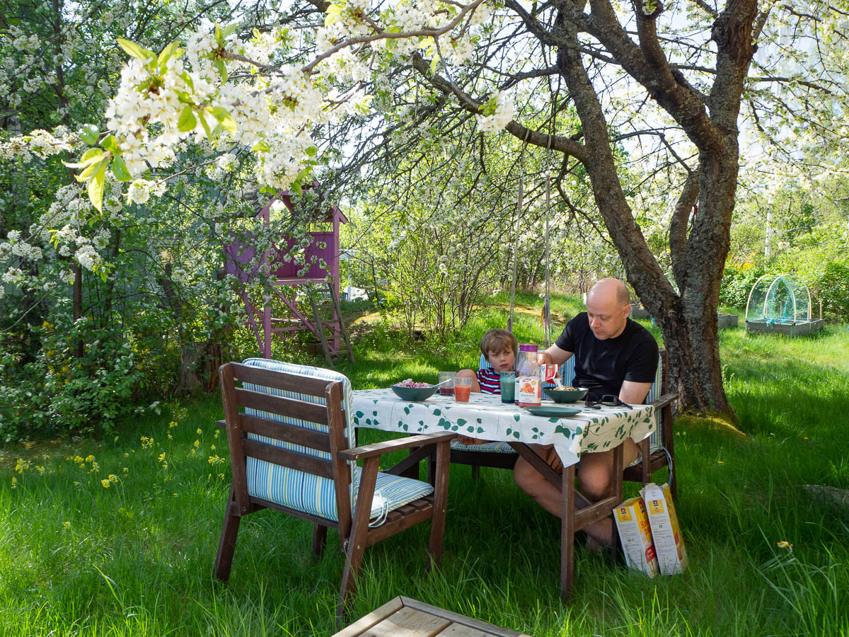 It’s too hot to eat breakfast in full sun on the deck, so we moved the furniture out onto the unmown lawn.