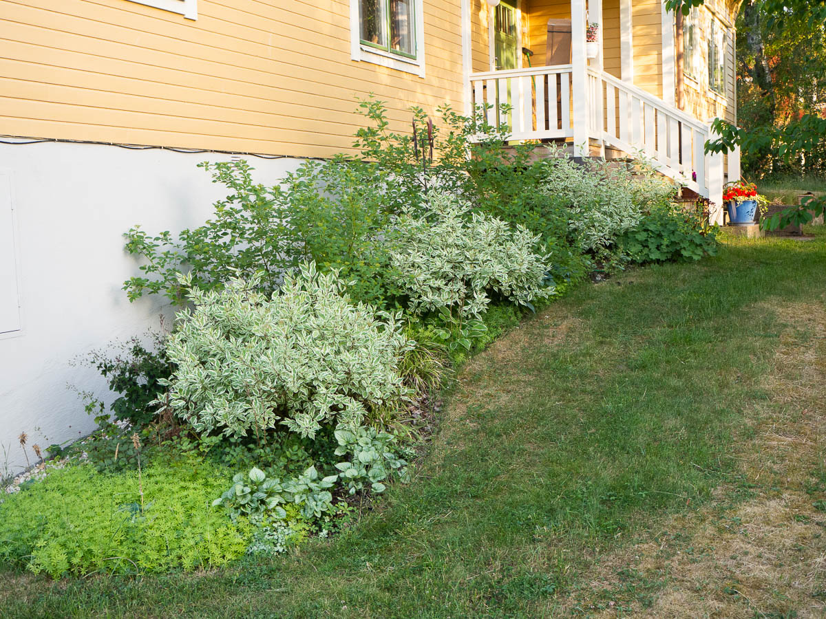 Lady’s mantle is in great shape; so are the new Bergenias that I bought last year. And the Galium is spreading like a weed. It’s hemmed in by the house and the steel edging that separates the flowerbed from the lawn, otherwise I’d worry about it taking over the whole garden.
