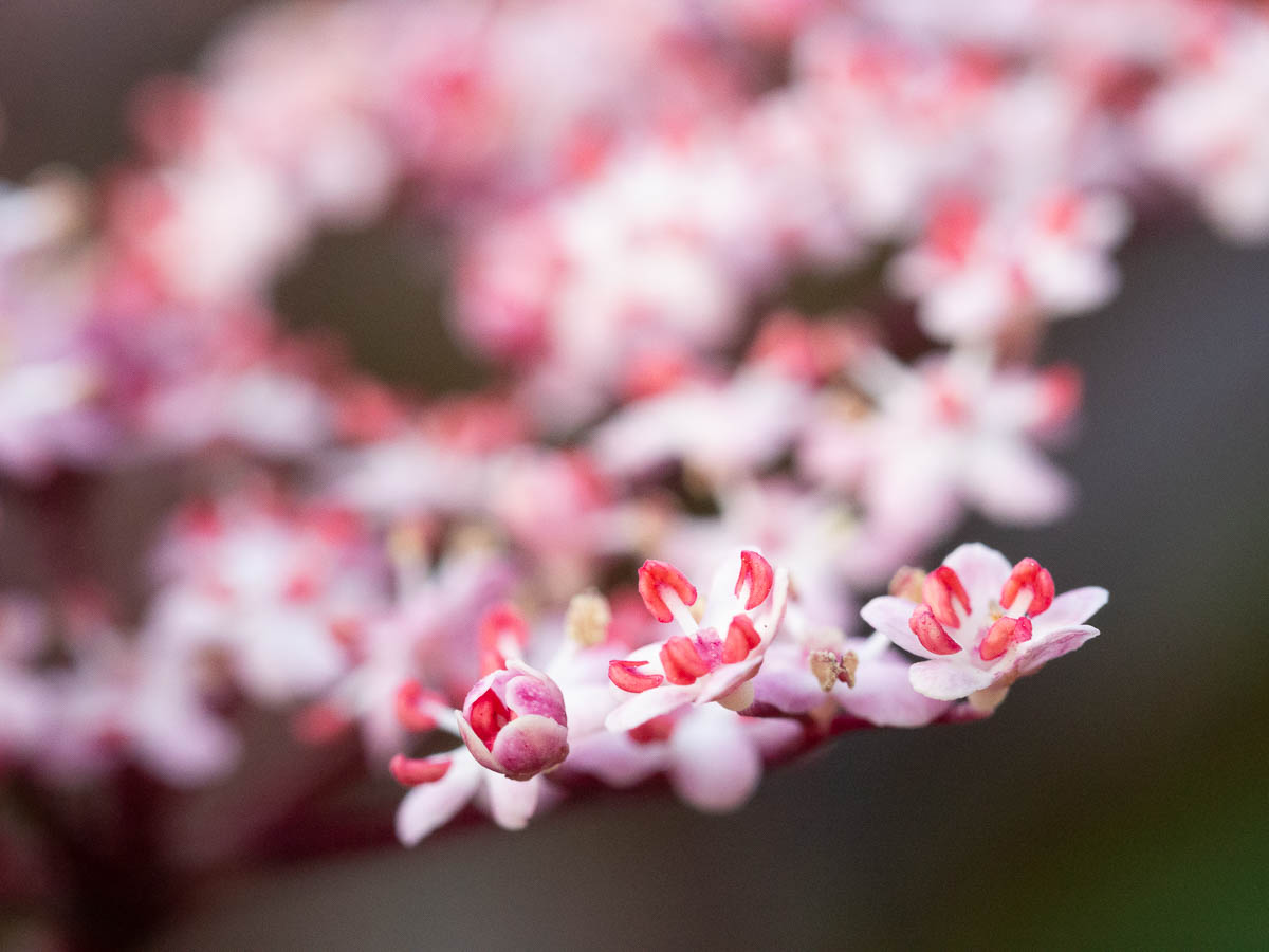 The black-leaved elder (‘Black Beauty’) is flowering in pink. The blossoms are brightest when they just open, and then fade towards a softer, creamy pink.