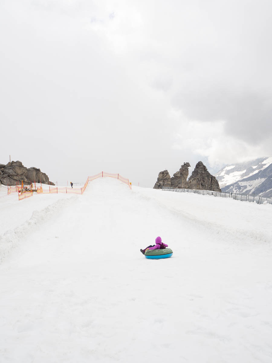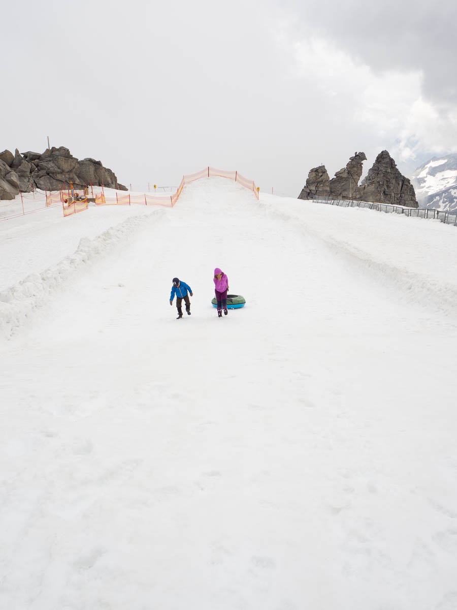 We had no plans to do any skiing, but there were some snowy attractions for kids. They had fun sledding on inflated rubber tubes, but the snow kept getting into Adrian’s sandals.