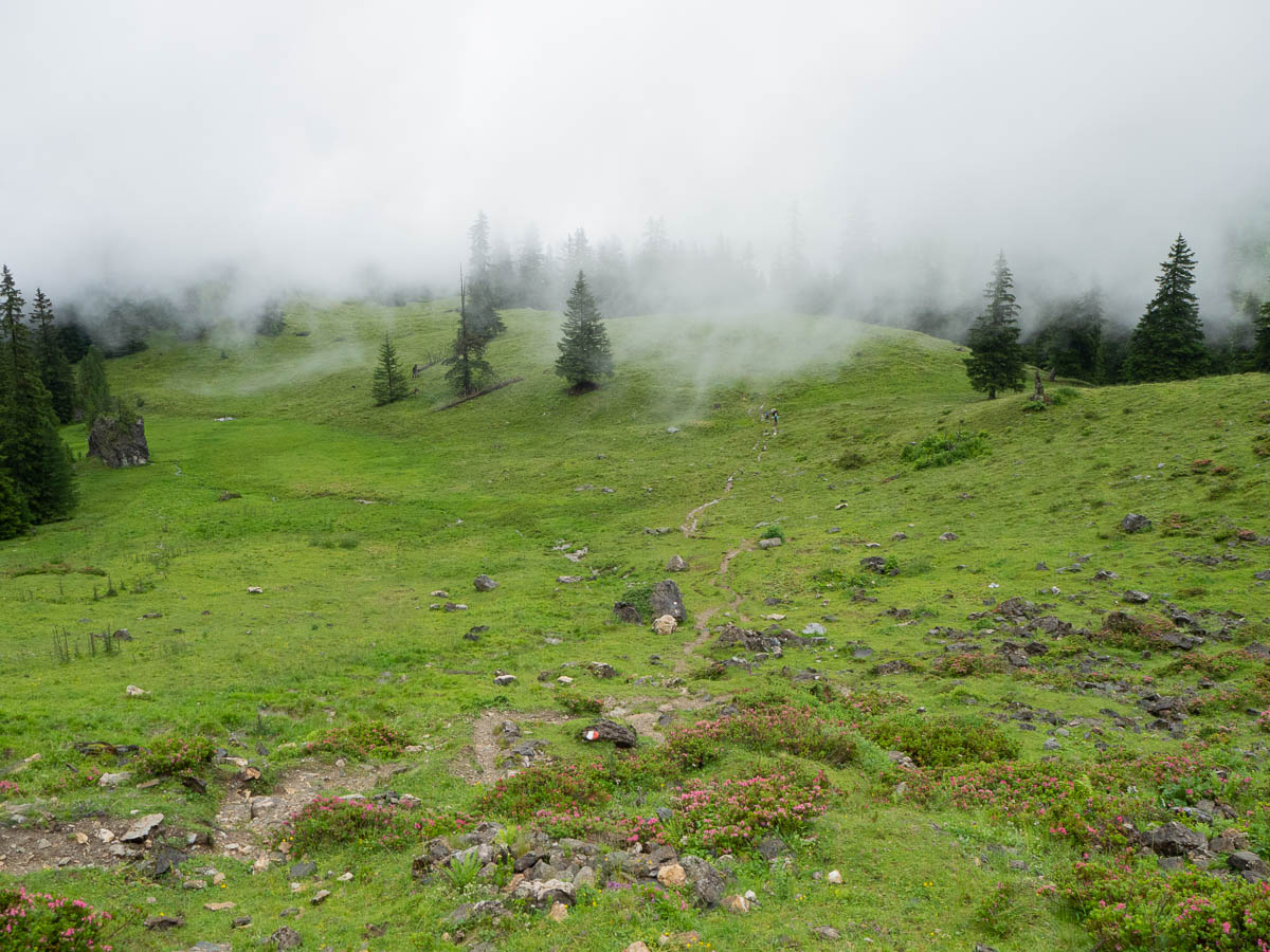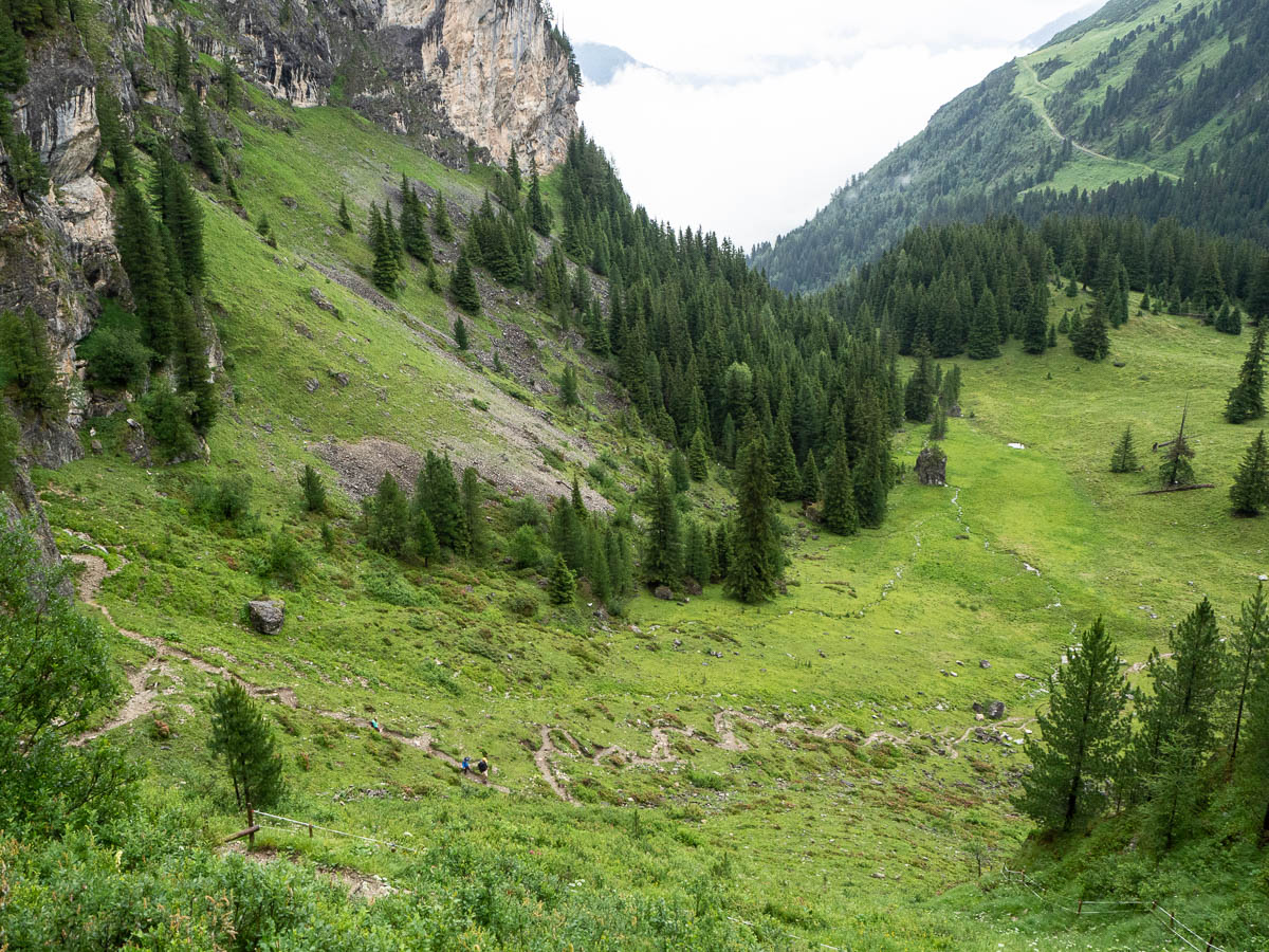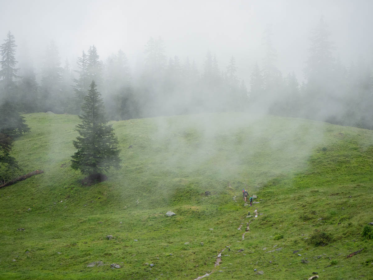 This was a very picturesque walk, like most of them here – steep rocky mountains, winding paths with wide views, meadows dotted with fir and pine, lovely little brooks and waterfalls.