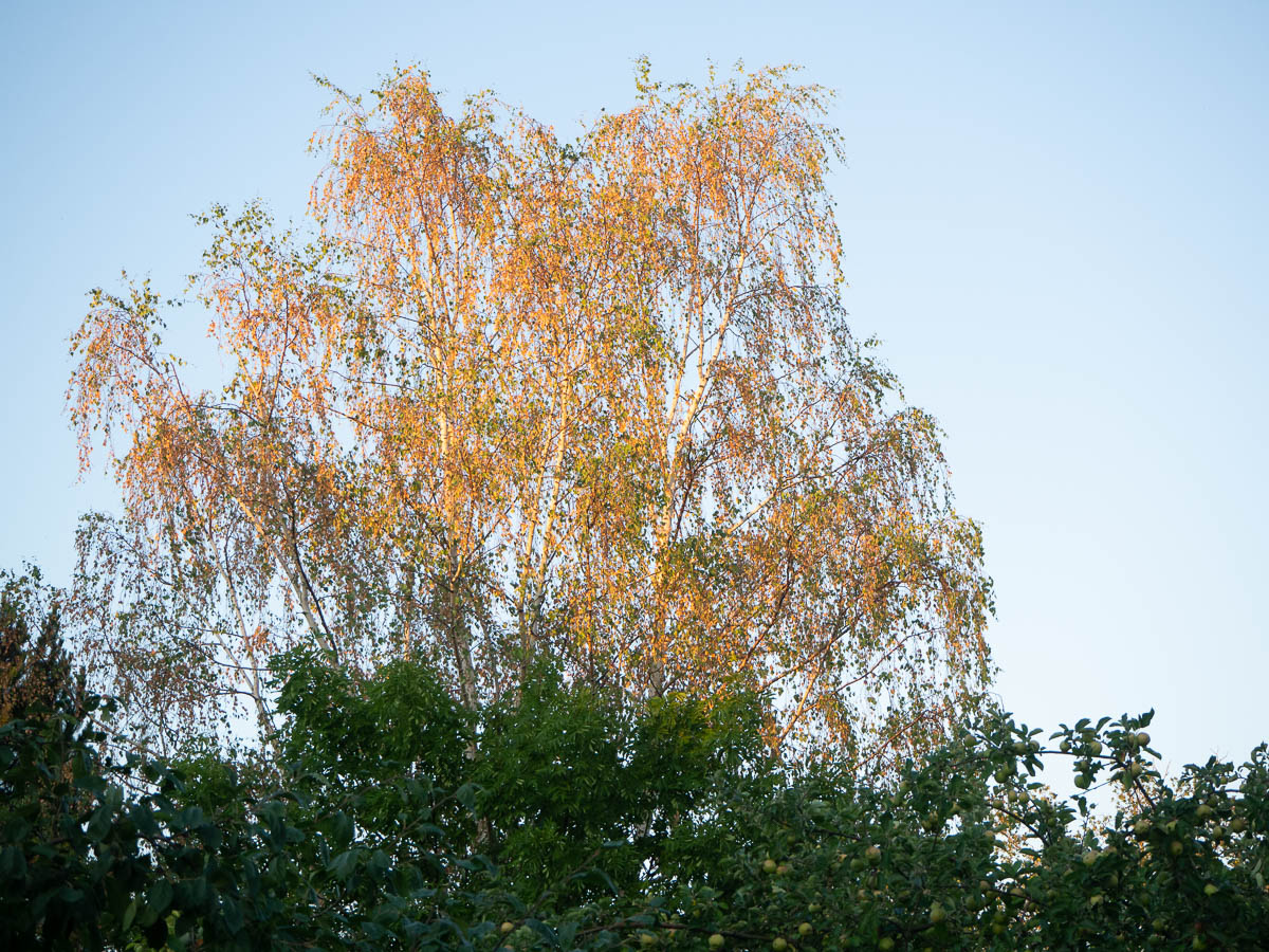 The lawn has been dead for a long while. Now even large trees are being affected by this summer’s drought. This is what several nearby birches look like: the leaves all dead and yellow, even though autumn is still far away.