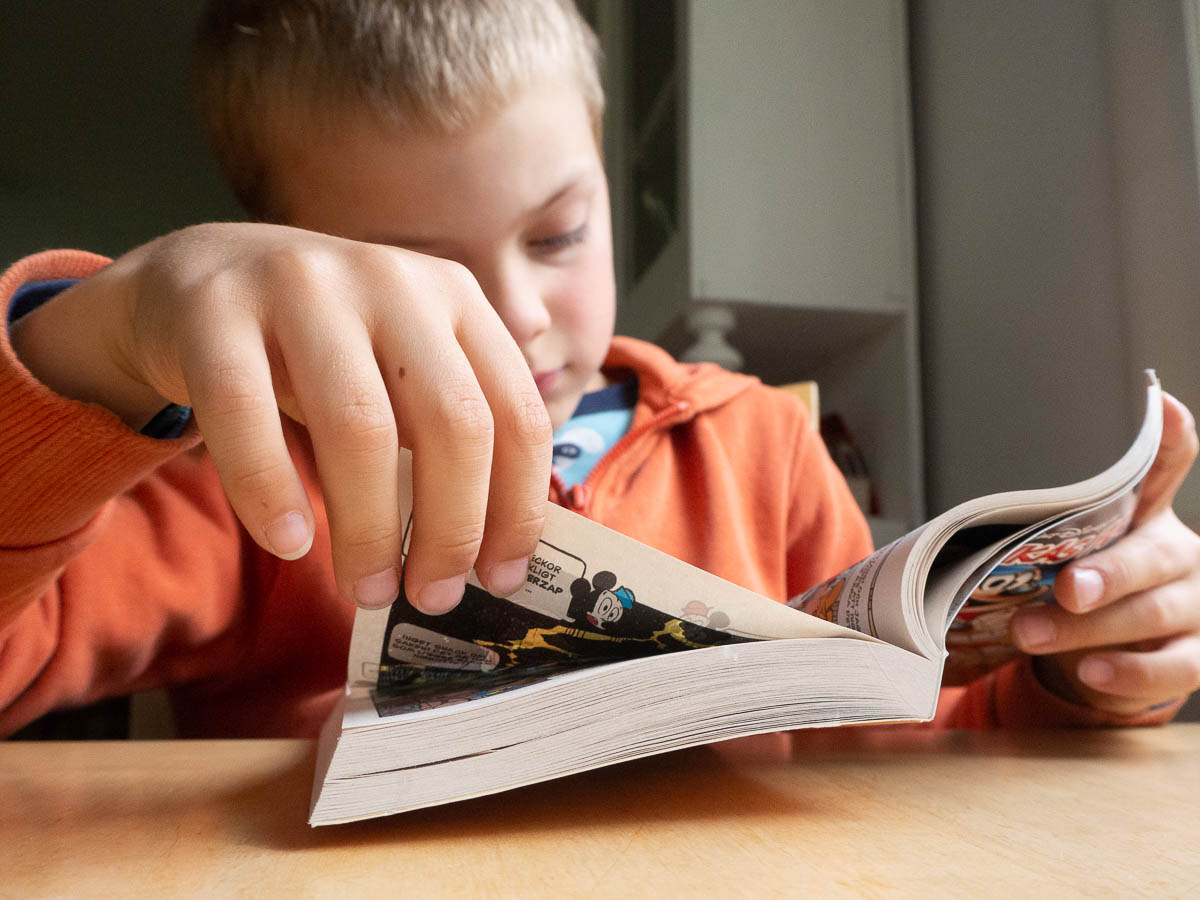 Adrian reading Kalle Anka pocket. He is going through them like a machine. He starts his day with Kalle Anka, picking one up before he goes to the breakfast table. He often ends his day with one, when it’s too late for most other activities. And he usually reads some more in between.