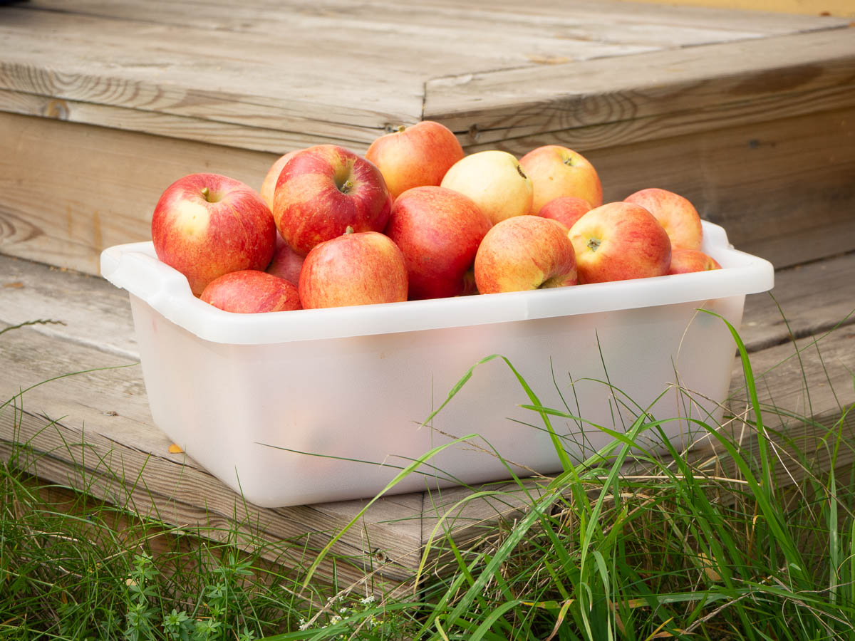 The apple tree has been dropping apples. I thought that meant it was time to pick them all, but when we tried doing that, most of the fruit still on the tree turned out to be not at all ripe yet – all greenish and stuck hard to the branch.