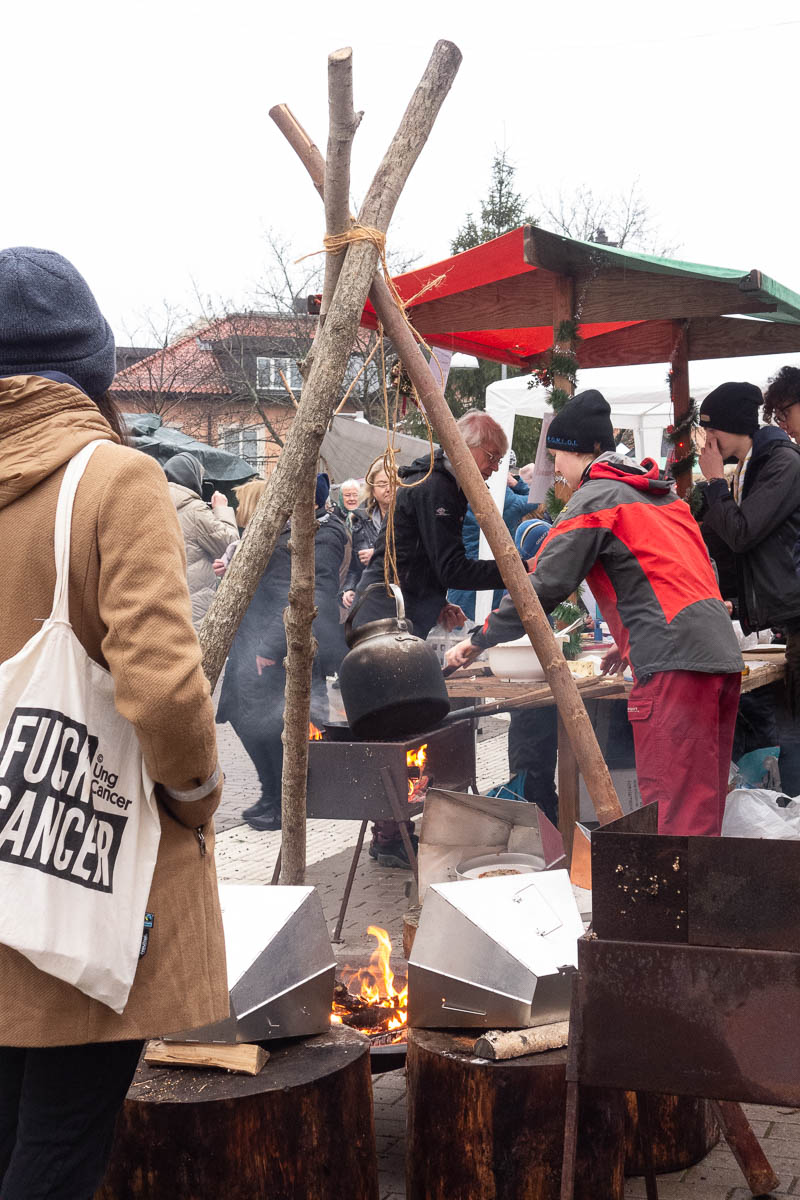 SpĂ„nga’s annual Christmas markets. Local small businesses, school classes and various clubs and organizations sell mostly Christmassy stuff, sweets and hand-crafted things. The scout group has several fun stalls, this year just like most years. The oldest scouts cook light meals over open flame – bacon omelettes and mini pizzas and such. The middle age groups sell toffees and sweets that Ingrid’s group made during last weekend’s “hike”. The younger ones have a lottery where you can win gingerbread houses that the scouts have decorated. Ingrid’s group manned a chocolate lottery wheel.